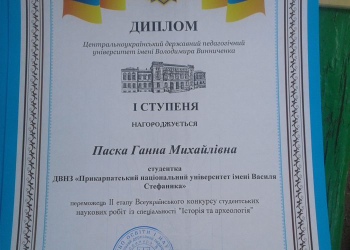 Професорсько-викладацький, деканат, студентський сенат і студентський профком Факультету історії, політології і міжнародних відносин щиро вітає з перемогою на останньому етапі Всеукраїнського конкурсу студентських наукових робіт з історії студентку Ганну Паску та її наукового керівника Андрія Зіновійовича Королька. Творчих успіхів і наснаги у подальшій науковій, навчальній і методичній роботі.