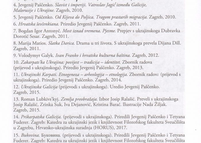 Бібліотека Ucrainiana Croatica, заснована кафедрою української мови і літератури Філософського факультету Загребського університету, має за мету представити хорватській аудиторії, студентам і широкій громадськості Україну шляхом перекладу наукових праць вчених України та інших країн. Тематичні збірники укладаються у співробітництві з науковими установами України, окремим авторами тощо. Зміст визначається актуальними проблемами, значними для хорватського адресату, якому представлено думку дослідників щодо питань, які становлять інтерес і для хорватського читача.