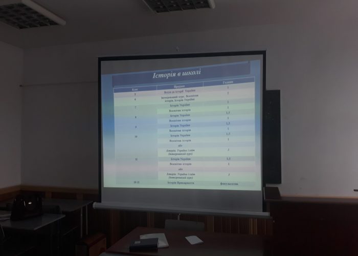 Остання частина пізнавальної лекції була присвячена питанню тижневого навантаження вчителів історії і суспільствознавчих предметів у закладах загальної середньої освіти. Іванна Вікторівна наголосила, що сьогодні синхронізовано подання уроків з історії України та всесвітньої історії (хронологія історичних подій). А тому в 6 класі школярі отримують знання з інтегрованого курсу «Всесвітня історія. Історія України» (2 год. на тиждень), натомість у 5 класі читається школярам предмет «Вступ до історії України» (1 год. на тиждень). У 7–9 класах школярам роздільно читається «Історія України» (1,5 год. на тиждень) та «Всесвітня історія» (1 год. на тиждень). Тоді як у 10 і 11 класах для вчителів історії і суспільствознавчих предметів є варіативний підхід обрання читання дисциплін: або окремо читати «Історію України» (1,5 год. на тиждень) та «Всесвітню історію» (1 год. на тиждень), або окремо читати інтегрований курс «Історія: Україна і світ» (3 год. на тиждень). Вчителі історії і суспільствознавчих предметів у закладах загальної середньої освіти Тлумацького району факультативно у 10–11 класах читають школярам «Історію Прикарпаття».