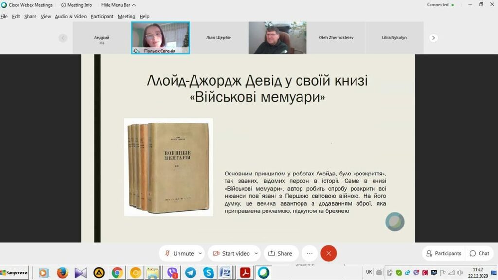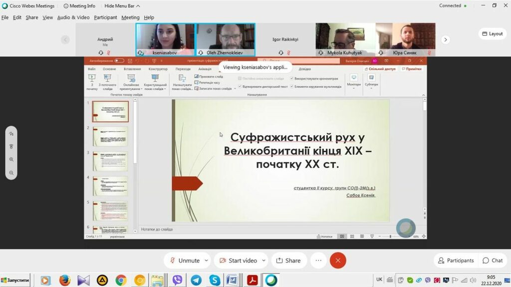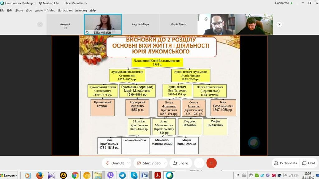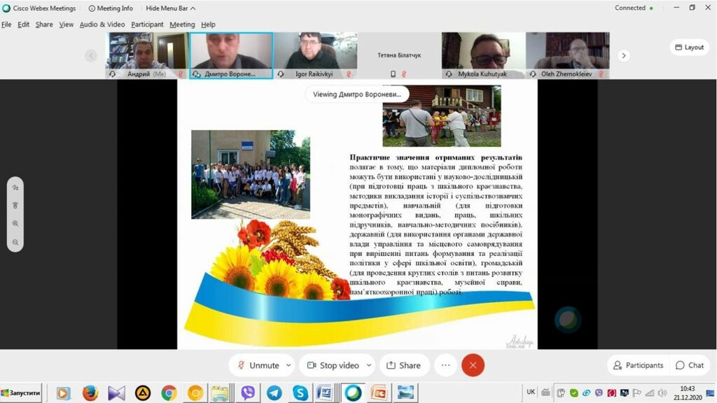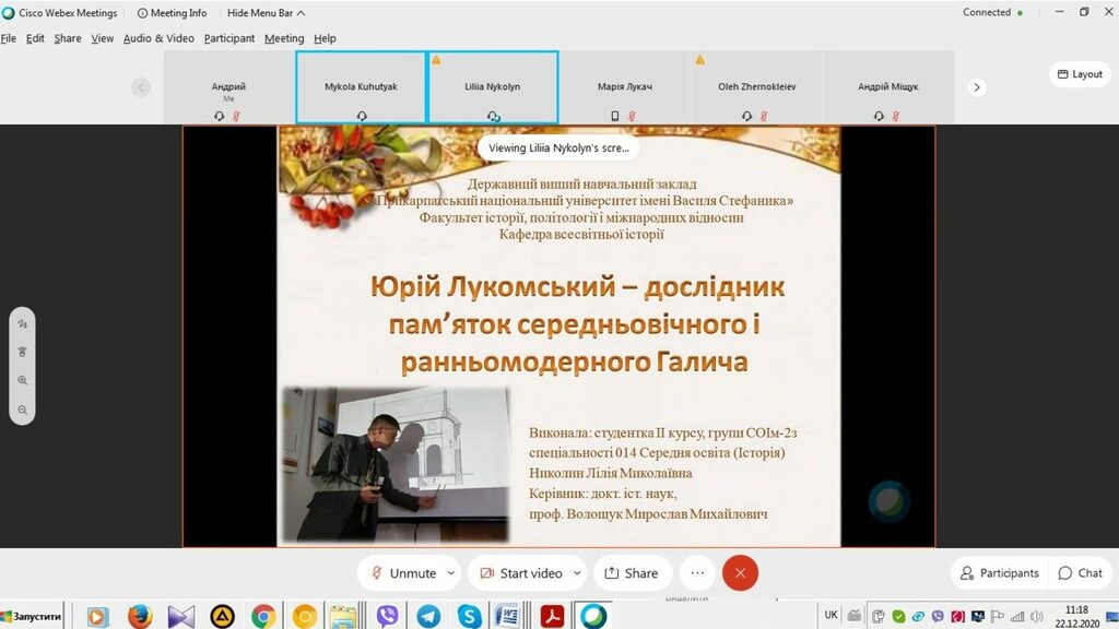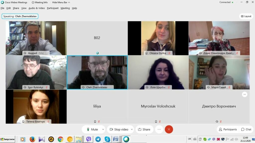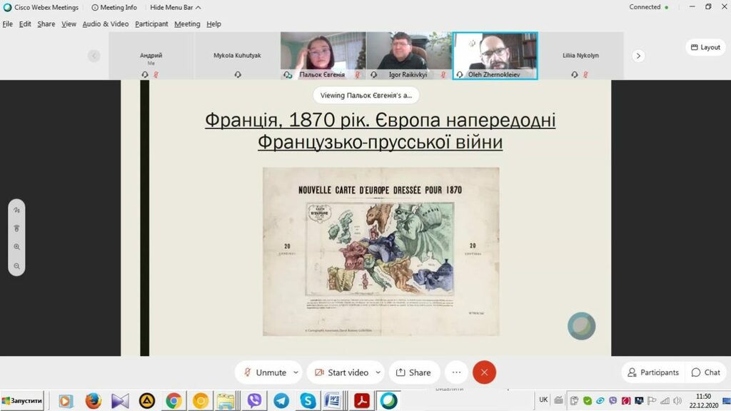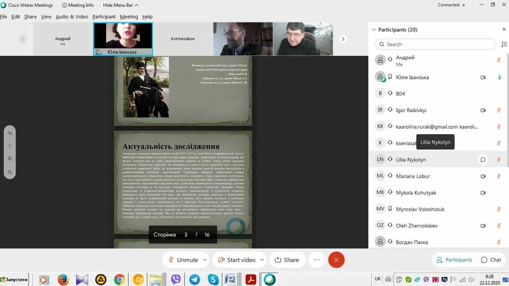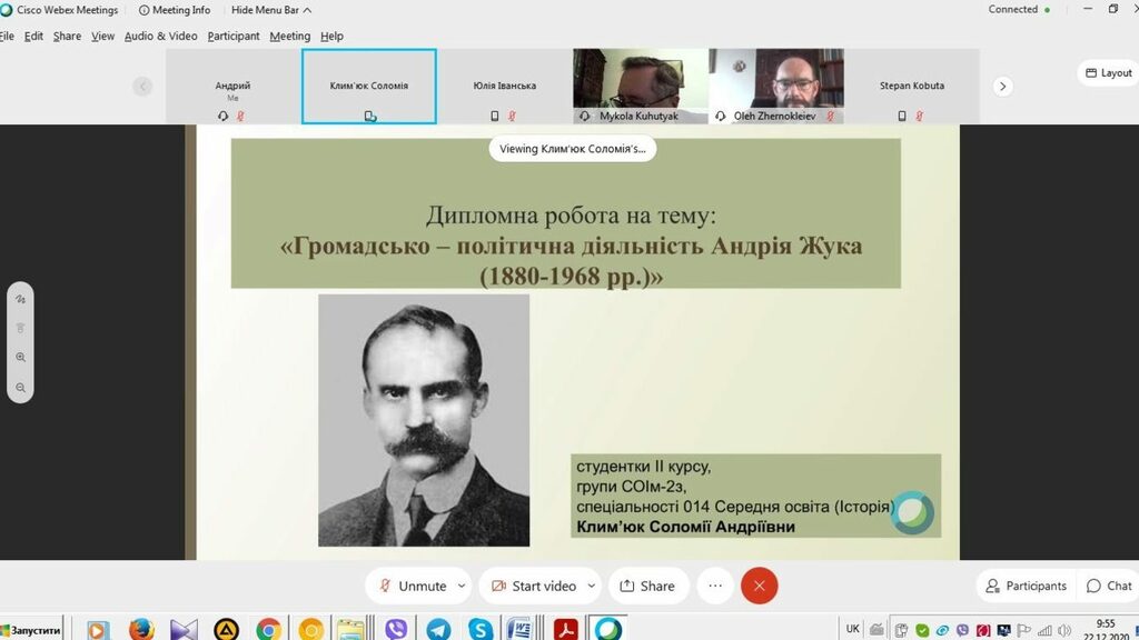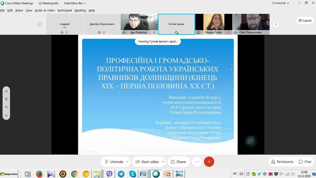 21–23 грудня 2020 р. відбувся успішний захист дипломних робіт за другим (магістерським) рівнем вищої світи студентів ІІ курсу спеціальності 014 «Середня освіта (Історія)» ОР «Магістр» (заочна форма навчання) за допомогою сервісу платформи Cisco Webex Meeting. Екзаменаційна комісія діяла у складі голови – проф. Жерноклеєва О.С., членів комісії – проф. Кугутяк М.В. і проф. Райківський І.Я. Усього захищали роботи 27 здобувачів освітнього рівня «Магістр». У роботі ЕК взяли також участь наукові керівники та рецензенти – професорсько-викладацький склад кафедри історії України і методики викладання історії, що є випусковою для спеціальності «Середня освіта (Історія)», а також викладачі кафедри всесвітньої історії та кафедри історії слов’ян.