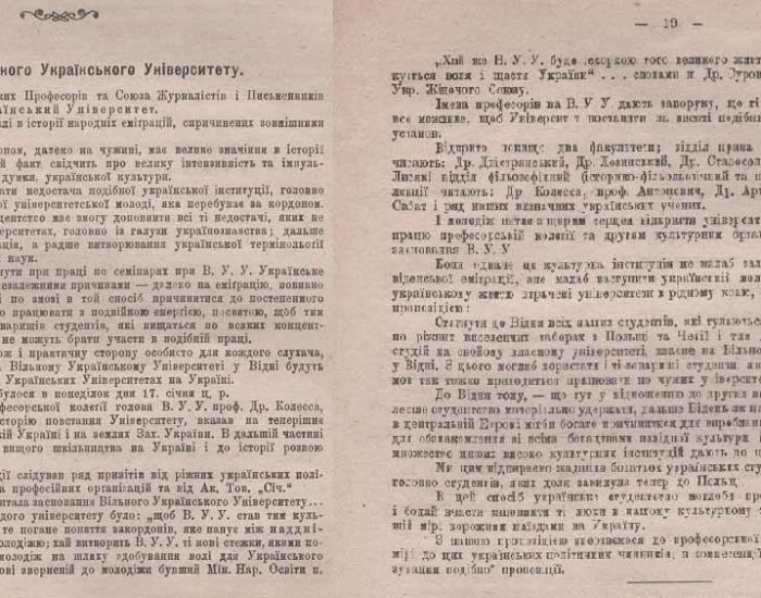 Український Вільний Університет (УВУ) протягом 100-річчя є основним українським науковим центром за кордоном. Університет було засновано з ініціативи Союзу українських журналістів і письменників, Товариства прихильників освіти та Українського соціологічного інституту, Університет розпочав свою роботу 1921 року в Відні. Через те, що столиця Австрії перестала бути центром української еміграції, Університет переїхав восени того ж року до Праги, де почав співпрацювати з Карловим університетом. Традиційно Університет складався з двох факультетів: філософського та правничого, а його управлінням керував сенат. Окрім українців, там навчалися німці, латиші, росіяни, румуни, євреї, угорці, білоруси та поляки. У 1945 році Університет залишився працювати в Празі до початку радянської окупації і лише частина професорського складу вирішила переїхати до Баварії.