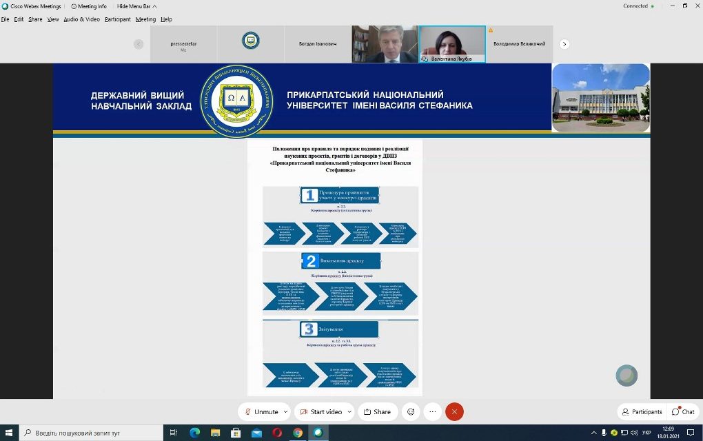 18 січня 2020 р. завідувачі кафедр та декан Факультету історії, політології і міжнародних відносин проф. М.В. Кугутяк взяли участь у черговому розширеному онлайн-засіданні ректорату. Учасники віртуальної зустрічі, а це – керівництво університету, директори інститутів та Івано-Франківського фахового коледжу, декани факультетів, завідувачі кафедр та керівники відділів – обговорили, зокрема, Положення про правила та порядок подання і реалізації наукових проєктів, грантів і договорів. З даного питання виступила проректорка з наукової роботи Валентина Якубів. У своїй презентаційній доповіді вона звернула увагу на основні аспекти роботи в цьому напрямку. У контексті даного питання ректор Університету Ігор Цепенда наголосив на особистій відповідальності керівників проєктів та грантів на всіх етапах проведення.
