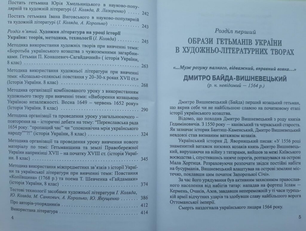 У навчально-методичному виданні містяться уривки творів української історичної поезії та прози, подано біографії гетьманів України Д. Байди-Вишневецького, П. Конашевича-Сагайдачного, Б. Хмельницького, Ю. Хмельницького, І. Виговського. У виданні також поміщені історико-біографічні портрети авторів творів, літературно-критичні есе, бібліографічні покажчики, методичні рекомендації з використання української історичної художньої літератури при вивченні історії України у закладах загальної середньої освіти. Навчально-методичне видання пропонується широкому загалу читачів: здобувачам освітніх послуг, вчителям студентам, усім хто цікавиться історією України та українською літературою.