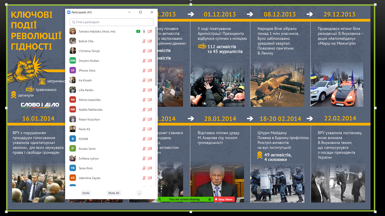 19 лютого 2021 р. відбувся онлайн-вечір «Рабів до раю не пускають», присвячений вшануванню пам’яті героїв Небесної Сотні. Студенти Факультету історії, політології і міжнародних відносин, учні старших класів Католицького ліцею ім. Святого Василія Великого та заступник декана Факультету, кандидат історичних наук, доцент кафедри історії України і методики викладання історії Тамара Галицька-Дідух говорили про причини Революції, її перебіг, згадували подвиг Героїв Небесної Сотні. Зауважували про важливість пам’яті про події Революції Гідності, особливо зараз, коли в Україні продовжує тривати гібридна війна. Це досвід нашої перемоги у вкрай несприятливих для нас обставинах. Обговорювали цінності, які відстоювали на Майдані, і за які продовжили боротися випускники і студенти нашого Факультету на Сході України.