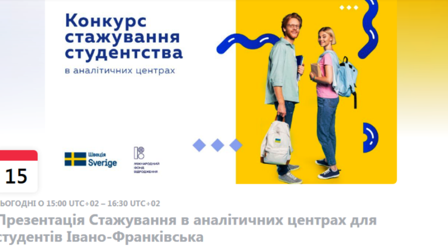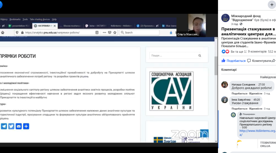 15 березня 2021 р. відбувся інформаційний день щодо конкурсу стажувань для молоді в рамках «Ініціативи з розвитку аналітичних центрів» в Україні. Його нещодавно оголосив Міжнародний фонд «Відродження». Тож, прикарпатці отримали повну інформацію про те, хто саме і за яких умов може пройти стажування з 12 квітня по 12 листопада та чому це варто зробити саме у Прикарпатському університеті! Всі бажаючі змогли поставити організаторам свої питання.