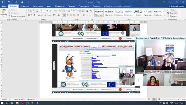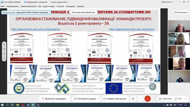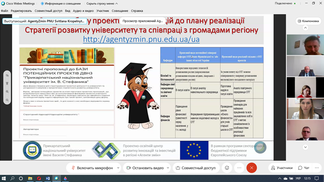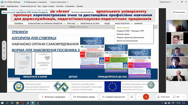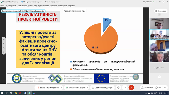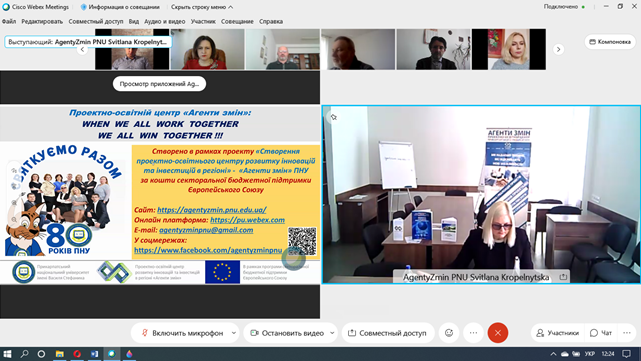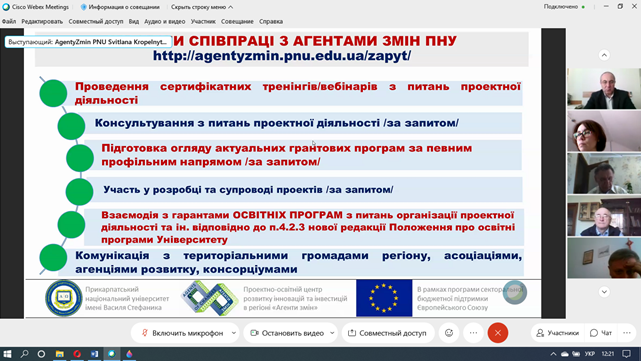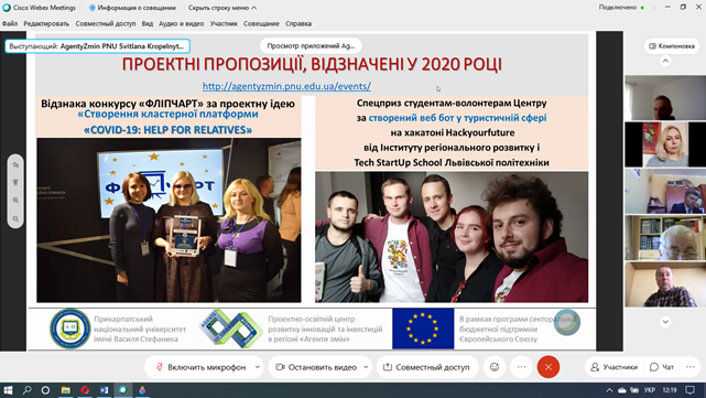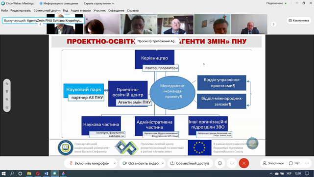 Які можливості для підрозділів Прикарпатського університету відкриває співпраця з АГЕНТАМИ ЗМІН? Про це 12 квітня 2021 р. на розширеному засіданні ректорату, на якому були присутні завідувачі кафедр та декан Факультету історії, політології і міжнародних відносин, розказала директорка Проектно-освітнього центру «Агенти змін» університету Світлана Кропельницька. Вона представила колегам конкретні напрямки, за якими АГЕНТИ ЗМІН можуть бути корисні своїм колегам.