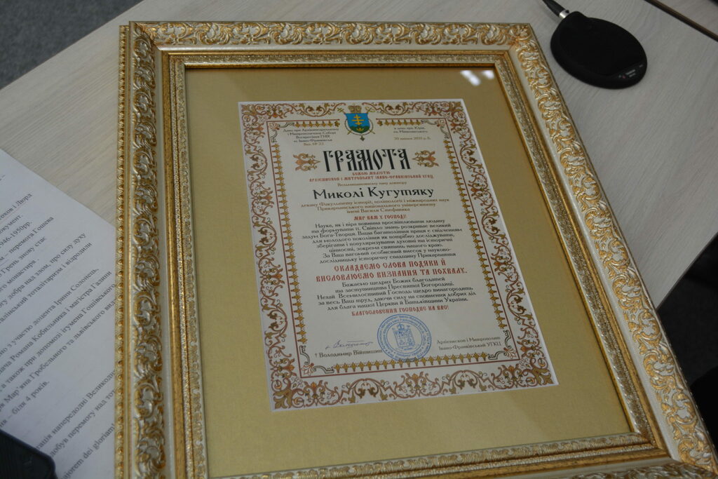 Окремо Митрополит звернувся до професора Миколи Кугутяка зі словами подяки і вручив грамоту із благословенням: «Наука, як і віра повинна просвітлювати людину та формувати її. Світло знань розкриває великий задум Бога-Творця. Ваша багатолітня праця є свідченням для молодого покоління як потрібно досліджувати, зберігати і популяризувати духовні та історичні цінності, зокрема святинь нашого краю. За Ваш вагомий особистий внесок у науково-дослідницьку історичну спадщину Прикарпаття складаємо слова подяки й висловлюємо визнання та похвалу. Бажаємо щедрих Божих благодатей та заступництва Пресвятої Богородиці. Нехай Всемилостивий Господь щедро винагородить за весь Ваш труд, даючи силу на сповнення добрих діл для блага нашої Церкви й Батьківщини України. Благословення Господнє на Вас!».
