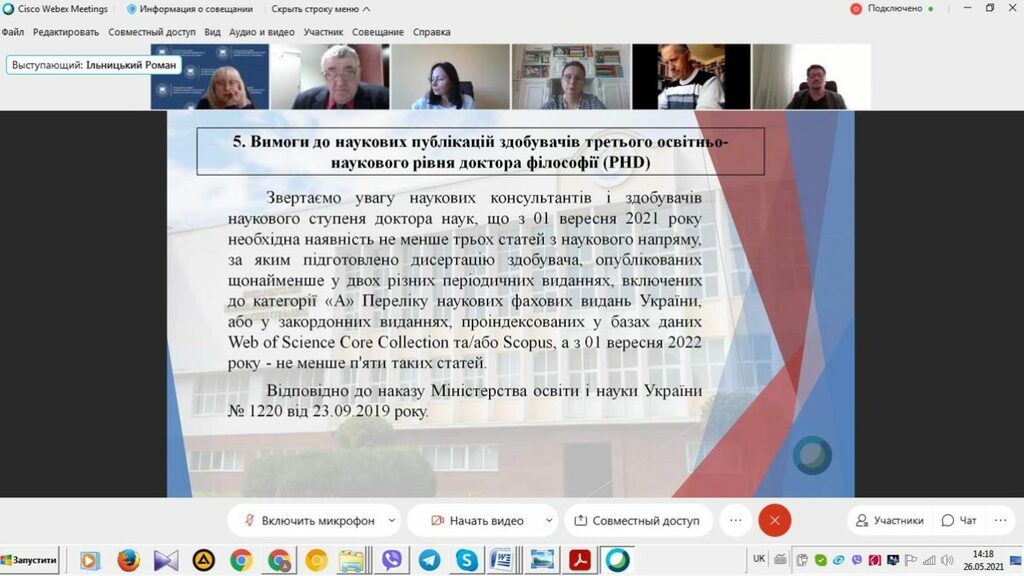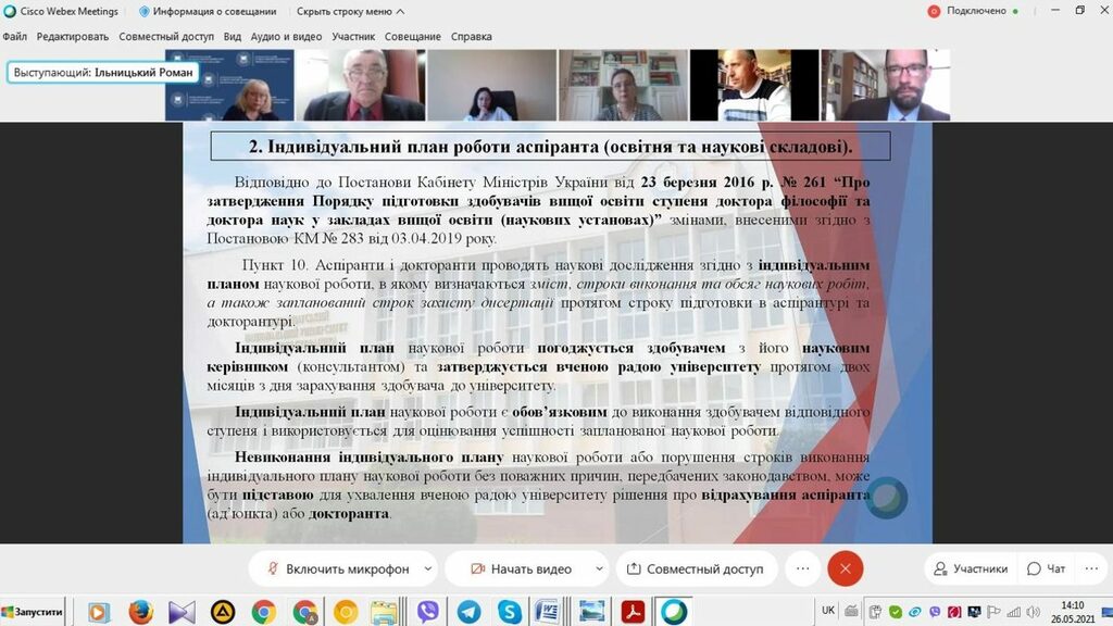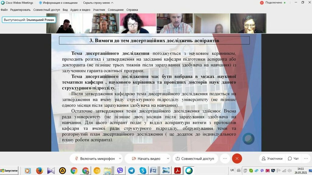 На цій зустрічі завідувач відділу аспірантури і докторантури Роман Ільницький ознайомив усіх присутніх з методичними рекомендаціями щодо оформлення індивідуального плану роботи аспіранта (освітня та наукові складові), вимогами до визначення тем дисертаційних досліджень аспірантів, положенням про педагогічну практику аспірантів, вимогами до наукових публікацій здобувачів третього освітньо-наукового рівня доктора філософії (PhD), особливостями створення разових спеціалізованих рад для захисту дисертацій на здобуття освітньо-наукового рівня доктора філософії. Зокрема, було звернуто увагу на належне виконання здобувачами третього освітньо-наукового рівня доктора філософії індивідуального навчального плану та індивідуального наукового плану, розкрито вимоги до наукових публікацій науково-педагогічних працівників (наукових керівників, рецензентів, голів разових спеціалізованих вчених рад, опонентів) та здобувачів при створенні разових спеціалізованих рад для захисту докторів філософії, охарактеризовано особливості підготовки здобувачами PhD дисертаційних робіт та захисту їх у разових спеціалізованих вчених радах, тощо. Обговорено проєкт постанови Кабінету Міністрів України «Про затвердження Порядку присудження ступеня доктора філософії та скасування рішення разової спеціалізованої вченої ради закладу вищої освіти, наукової установи про присудження ступеня доктора філософії», інших нормативних документів у цій царині, прийняті Міністерством освіти і науки України та Кабінетом Міністрів України.