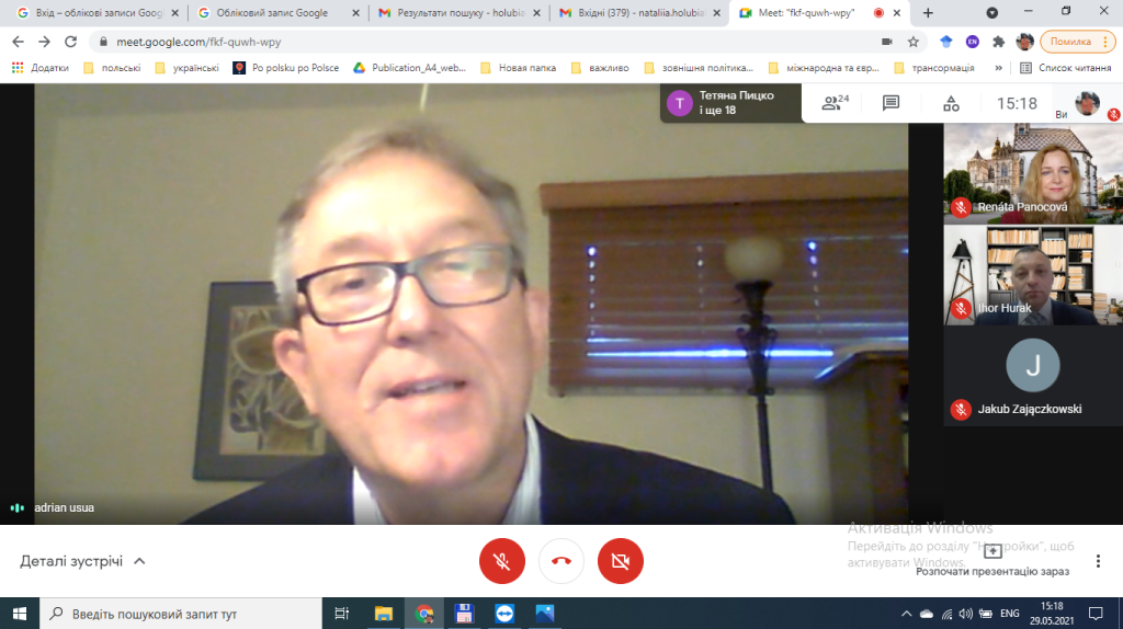 Традиційно в рамках подібного роду заходів поряд з молодими вченими в якості ключового спікера із більш розгорнутою доповіддю виступають одна або дві досвідченіші особи. В даному випадку такою особою був відомий американський журналіст, очільник української служби «Голосу Америки» (2005–2015 рр.) Адріян Кармазин. Він представив своє бачення розвитку політичних процесів в Україні протягом останніх десятиліть, охарактеризував особливості роботи української служби «Голосу Америки», поділився спогадами про труднощі, які виникали під час підготовки чи презентації політично-чутливих матеріалів про Україну. Особливу увагу Адріан Кармазин звернув на питання незалежності та неупередженості медіа, роль медіа як надійного джерела новин, здатного формувати світосприйняття аудиторії, а також небезпеки, пов’язані з поширенням неправдивої інформації, зокрема в умовах інформаційної війни.