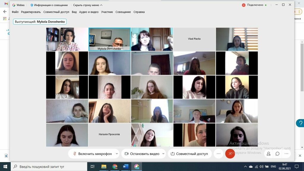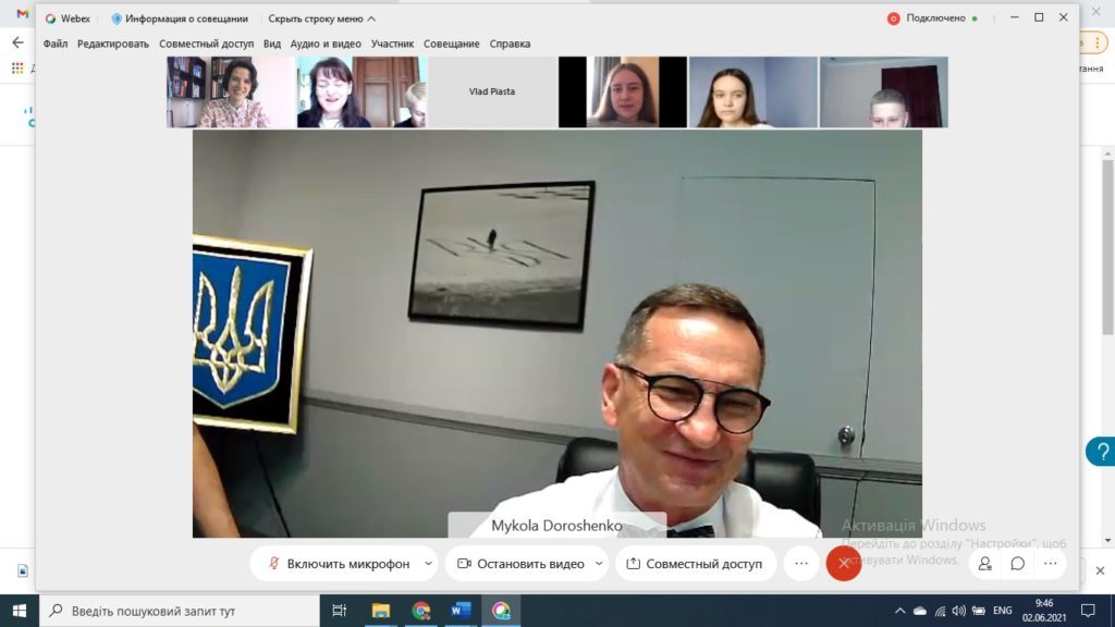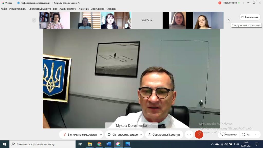 2 червня 2021 р. у рамках проєкту «Зустріч з дипломатами» студенти спеціальності 291 Міжнародні відносини, суспільні комунікації та регіональні студії та викладачі кафедри міжнародних відносин Факультету історії, політології і міжнародних відносин мали нагоду поспілкуватися онлайн з відомим українським дипломатом, Надзвичайним і Повноважним Послом України у Республіці Узбекистан Миколою Петровичем Дорошенком.