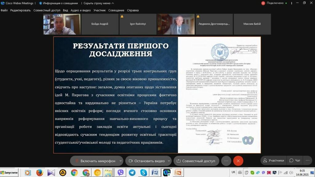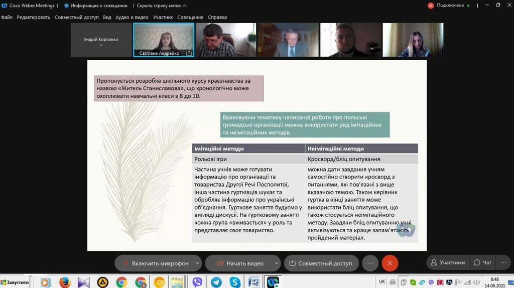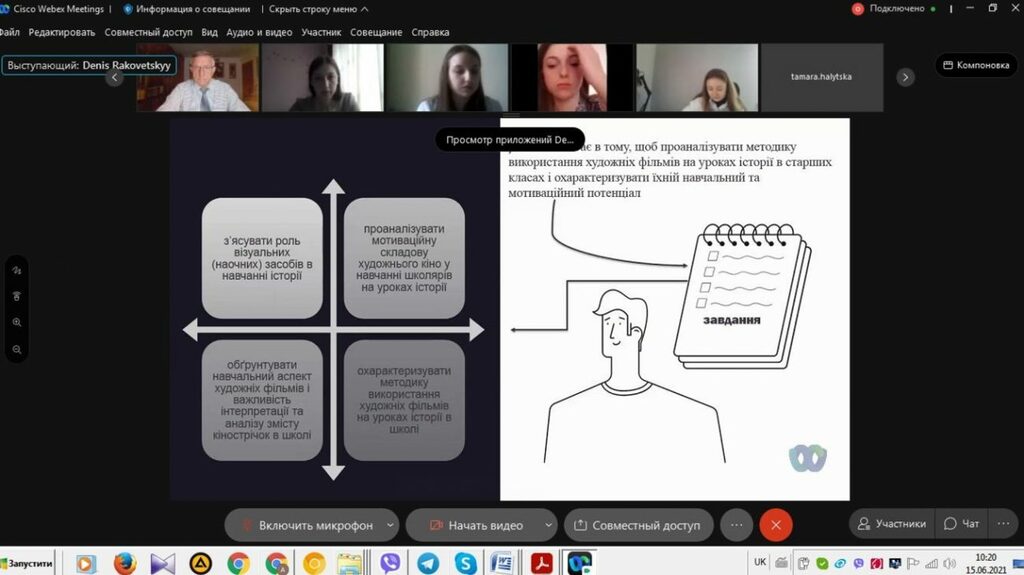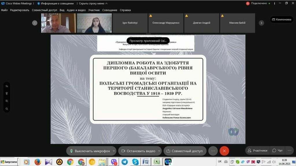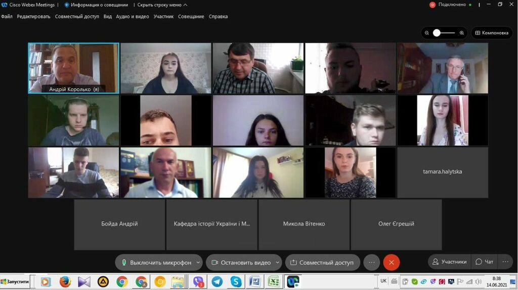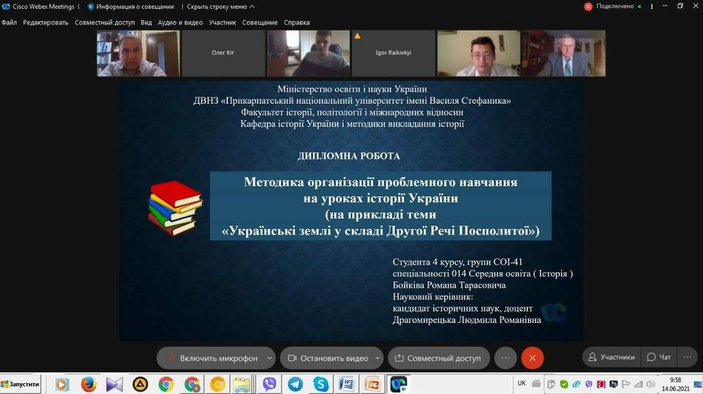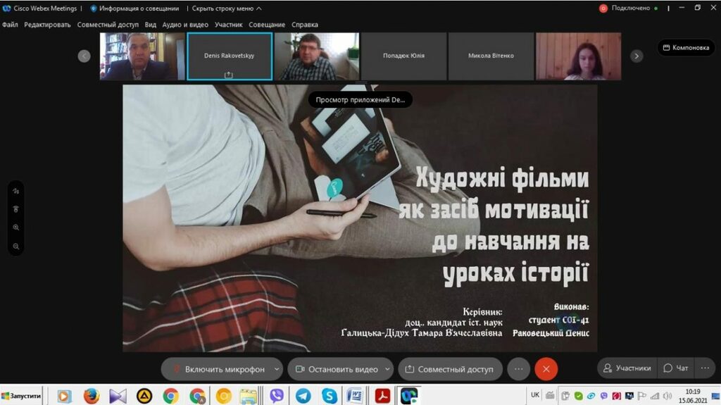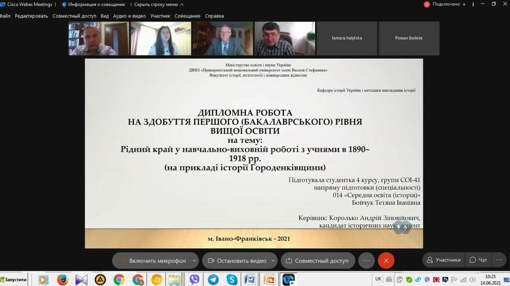 З 14 до 19 червня 2021 р. триває підсумкова атестація здобувачів вищої освіти ІV курсу спеціальності 014 Середня освіта (Історія) ОР «Бакалавр» (денна і заочна форма навчання). Студенти захищали свої кваліфікаційні роботи та здавали кваліфікаційний екзамен в режимі онлайн на відеоплатформі Webex Cisco Meetings.