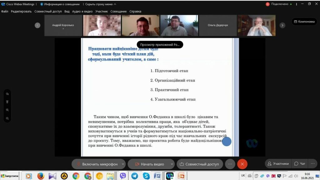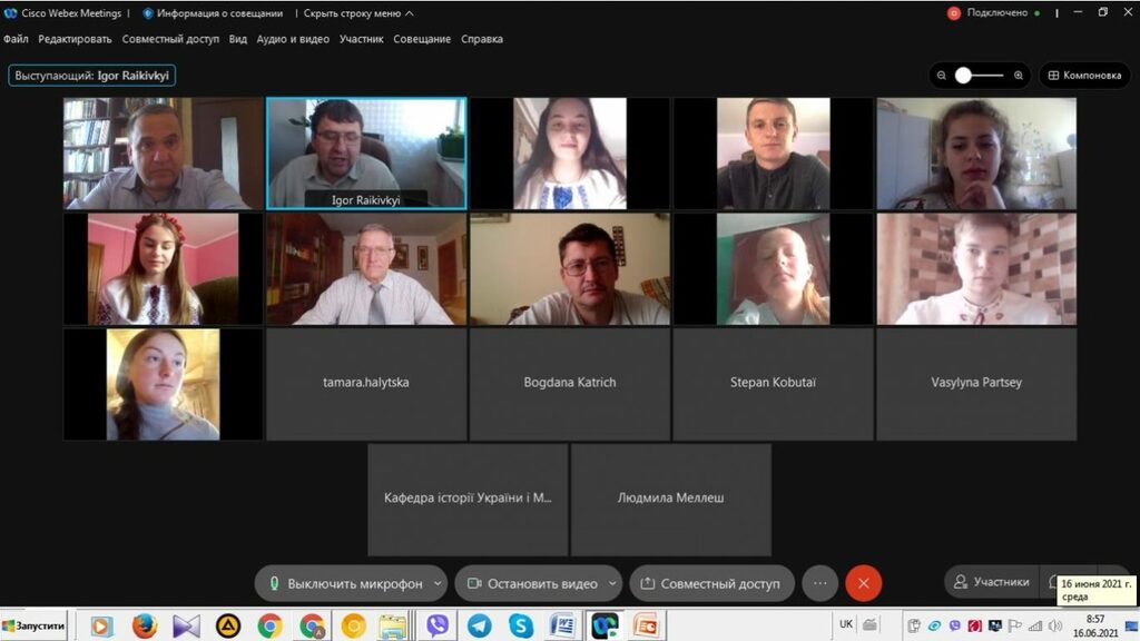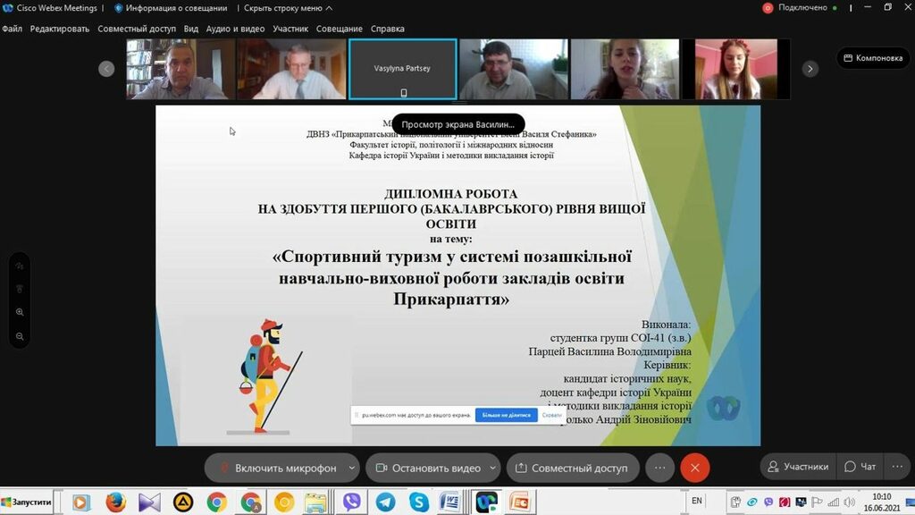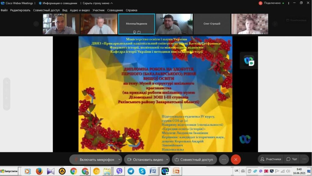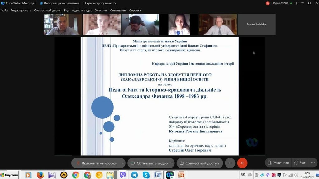 16 червня 2021 р. відбувся успішний захист дипломних робіт за першим (бакалаврським) рівнем вищої світи восьми студентів ІV курсу спеціальності 014 Середня освіта (Історія) ОР «Бакалвр» (заочна форма навчання) за допомогою сервісу платформи Cisco Webex Meeting. Екзаменаційна комісія діяла у такому складі: голова – проф. Райківський І.Я., члени комісії – доц. Галицька-Дідух і доц. Марущенко О.В. Усього захищали роботи 8 студентів заочної форми навчання освітнього рівня «Бакалавр». У роботі ЕК взяли також участь наукові керівники та рецензенти – професорсько-викладацький склад кафедри історії України і методики викладання історії, що є випусковою для спеціальності 014 Середня освіта (Історія) ОР «Бакалавр». Виступи студентів-випускників були цікавими, змістовними, охоплювали різні аспекти (політичні, культурні, економічні, соціальні та ін.) як історії України, так і всесвітньої історії від давньоруських часів, періоду середньовіччя і до сучасності. Окремий розділ у кожній роботі був присвячений проблемі використання матеріалів дипломної роботи за першим (бакалаврським) рівнем вищої освіти в закладах загальної середньої освіти і закладах позашкільної освіти. Комісія звернула увагу на високий рівень підготовки, оволодіння фаховими компетентностями випускників спеціальності 014 «Середня освіта (Історія)» ОР «Бакалавр» (заочна форма навчання).