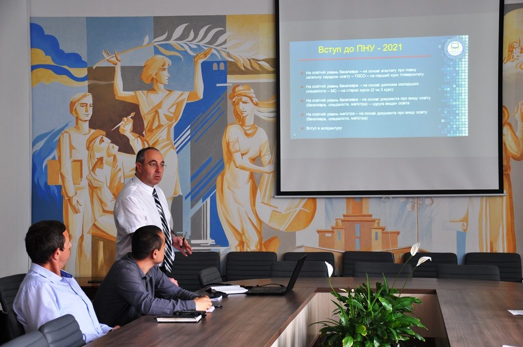 Відповідальний секретар приймальної комісії Едуард Лапковський провів для присутніх Презентацію, в ході якої звернув увагу на основні документи, які регулюють хід вступної кампанії – «Умови прийому на навчання для здобуття вищої освіти у 2021 році», затверджені Мін’юстом України та «Правила прийому до ДВНЗ «Прикарпатський національний університет імені Василя Стефаника» у 2021 році»», затверджені вченою радою Університету. Він детальніше зупинився на спеціальних умовах участі осіб пільгових категорій у конкурсному відборі на навчання в Університеті, умовах вступу на магістратуру, порядку зарахування на місця державного або регіонального замовлення, переведення під час навчання на контракті на вакантні місця державного (регіонального) замовлення.