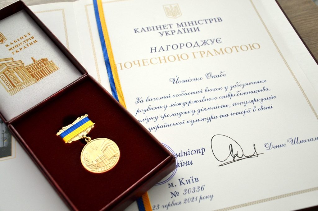 У рамках церемонії підписання Меморандуму Олександр Сич також оголосив про те, що за поданням Прикарпатського національного університету імені Василя Стефаника, згідно з рішенням Івано-Франківської обласної ради, доктора наук Йошіхіко Окабе нагороджено Почесною грамотою та медаллю Кабінету Міністрів України за внесок у розвиток японсько-українських відносин.