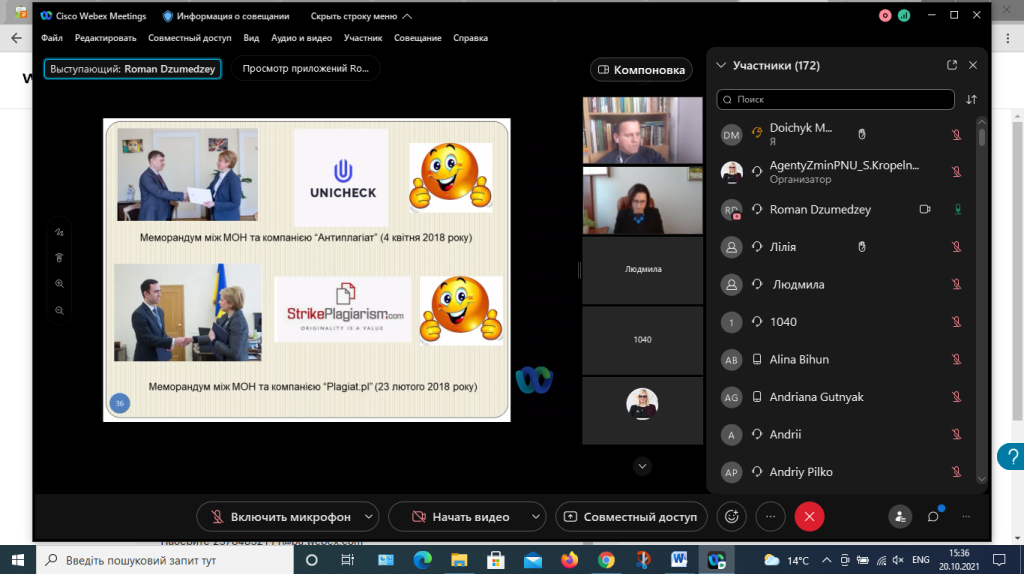 Цікавим та інформативним був виступ кандидата фізико-математичних наук Романа Дзумедзея, заступника директора Наукової бібліотеки Університету. Він детально розповів про типові та найпоширеніші помилки при написанні та оформленні наукових і кваліфікаційних праць, що призводять до плагіату або перевищення допустимих обсягів текстових збігів, дав цінні поради щодо різноманітних можливостей використання електронних ресурсів Наукової бібліотеки Університету для підготовки статей, дисертацій, дипломних робіт. Після завершення доповіді спікер відповів на численні запитання учасників онлайн-заняття.