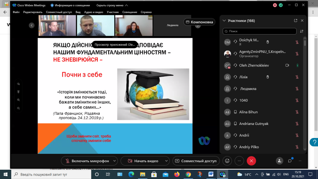 Завершив свій виступ професор Олег Жерноклеєв тезою про те, що дійсність часом не відповідає нашим фундаментальним цінностям, але не варто зневірюватися! Треба починати з себе. «Історія змінюється тоді, коли ми починаємо бажати змінити не інших, а себе самих…» (Папа Франциск, Різдвяна проповідь 24.12.2019 р.). Тож щоби змінити світ, треба спочатку змінити себе.
