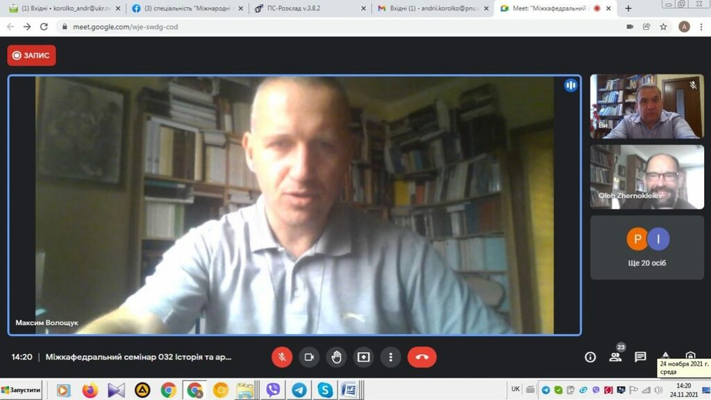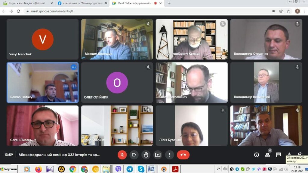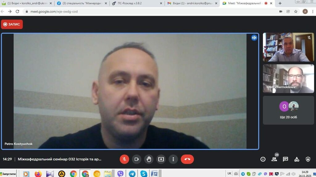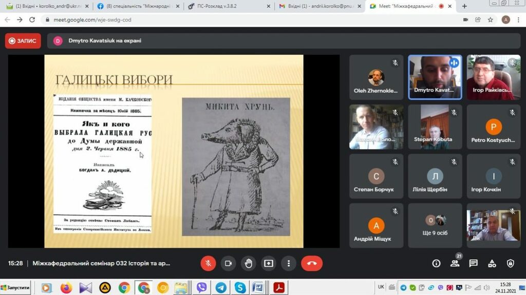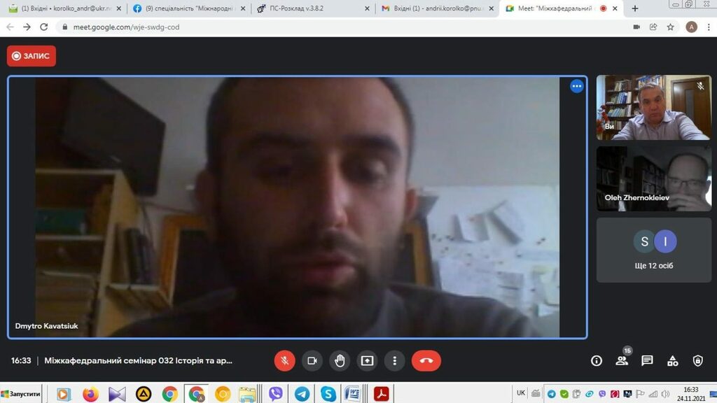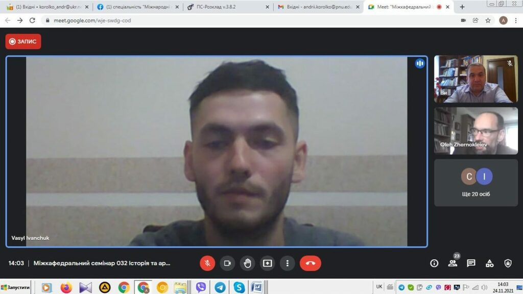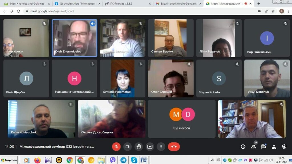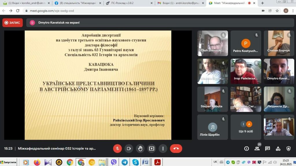 Відповідно до п. 14 Порядку проведення експерименту з присудження ступеня доктора філософії та наказів ректора Університету № 731–734 від 19 листопада 2021 р. «Про призначення складу фахового семінару», 24–25 листопада 2021 р. відбулися міжкафедральні фахові семінари кафедри всесвітньої історії та кафедри історії України і методики викладання історії для проведення попередніх експертиз дисертацій випускників аспірантури Прикарпатського національного університету імені Василя Стефаника: Іванчука Василя Петровича, тема дисертації «Померлі в обрядах і віруваннях кінця ХІХ – початку ХХІ століття (на матеріалах Гуцульщини)» (науковий керівник – кандидат історичних наук, доцент кафедри етнології і археології Костючок П.С.); Кавацюка Дмитра Івановича, тема дисертації – «Українське представництво Галичини в австрійському парламенті (1861–1897 рр.)» (науковий керівник – доктор історичних наук, професор, завідувач кафедри історії України і методики викладання історії Райківський І.Я.); Лизеня Євгена Володимировича, тема дисертації – «Миротворчі місії під час польсько-української війни 1918–1919 рр.» (науковий керівник – доктор історичних наук, професор кафедри всесвітньої історії Борчук С.М.); а також здобувача науково-освітнього ступеня кафедри історії та культури України ДВНЗ «Університет Григорія Сковороди в Переяславі» Стеценка Володимира Івановича, тема дисертації – «Діяльність цензурних органів в українських губерніях (1905–1907 рр.)» (науковий керівник – доктор історичних наук, професор кафедри методики викладання суспільних дисциплін і гендерної освіти Національного педагогічного університету імені М.П. Драгоманова). Головував на засіданні фахового семінару завідувач випускової кафедри всесвітньої історії доктор історичних наук, професор Жерноклеєв О.С.