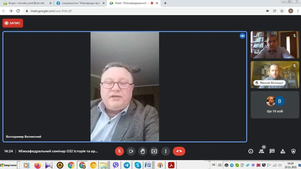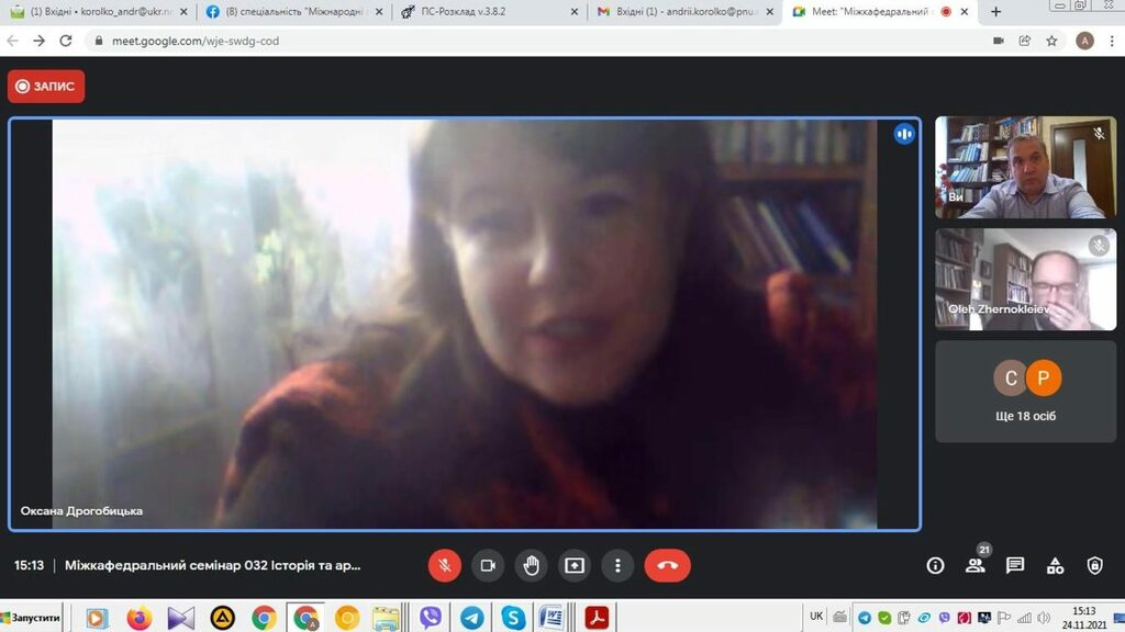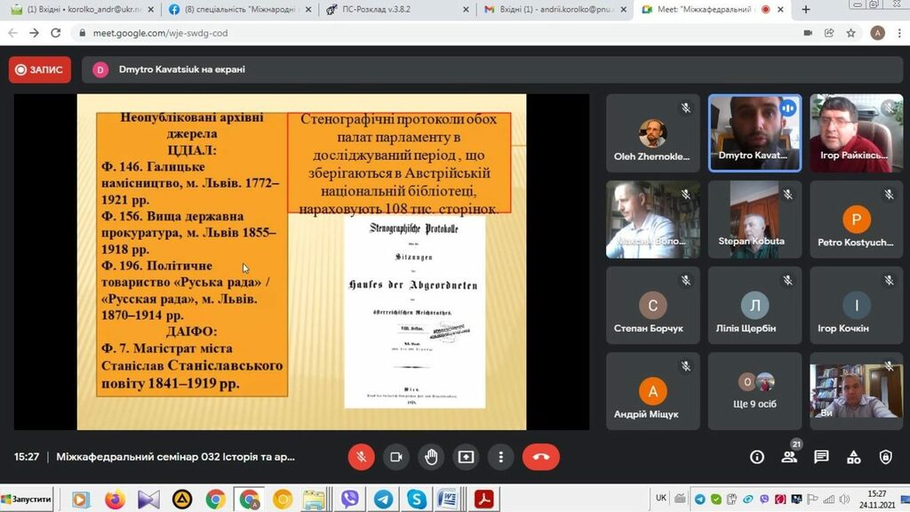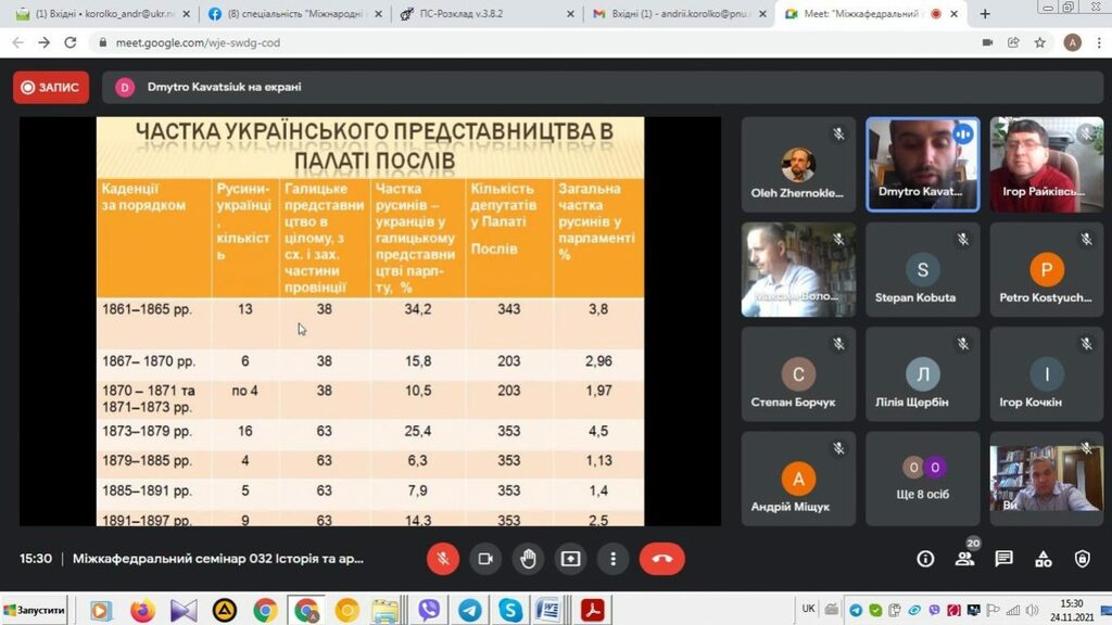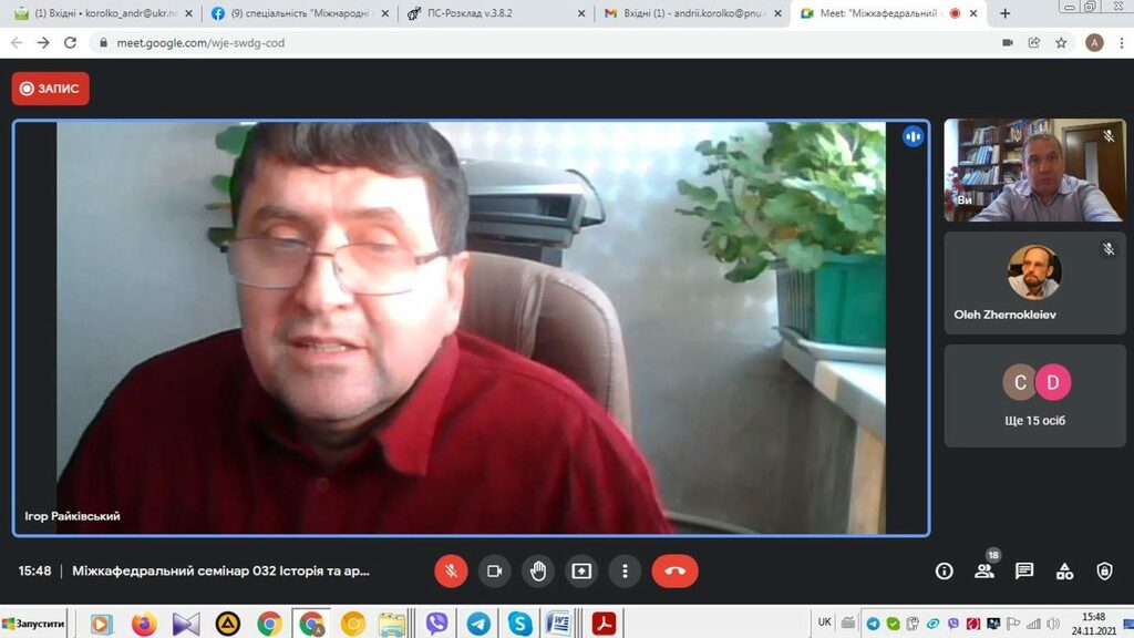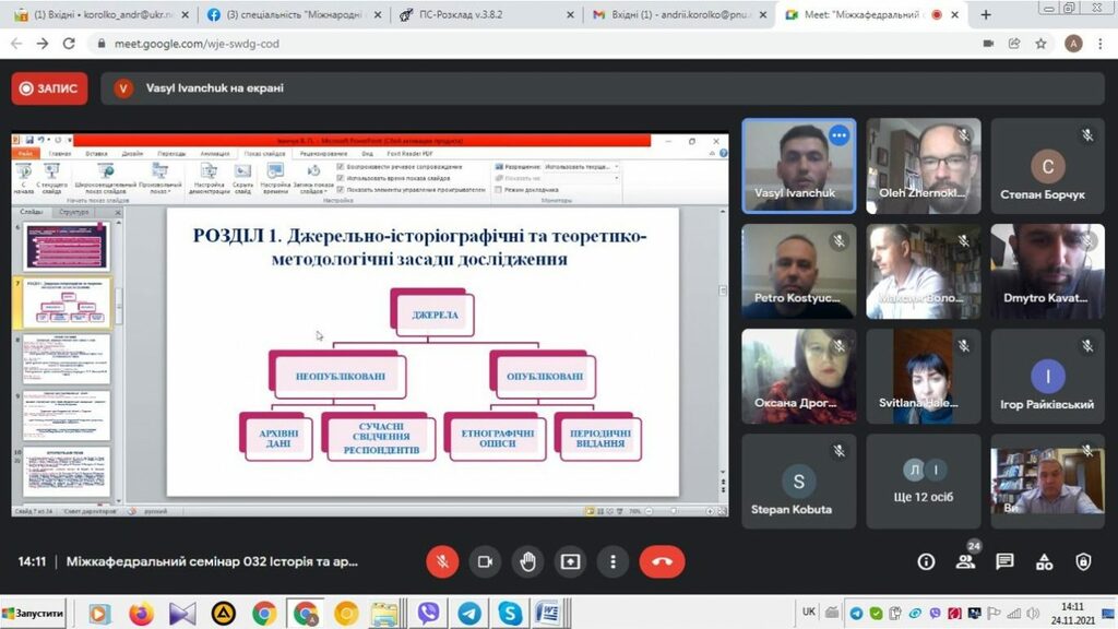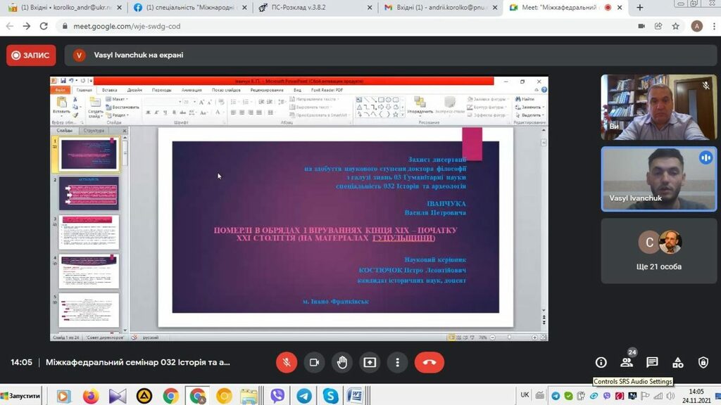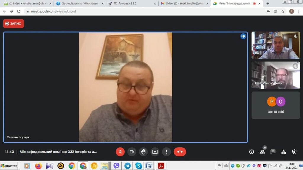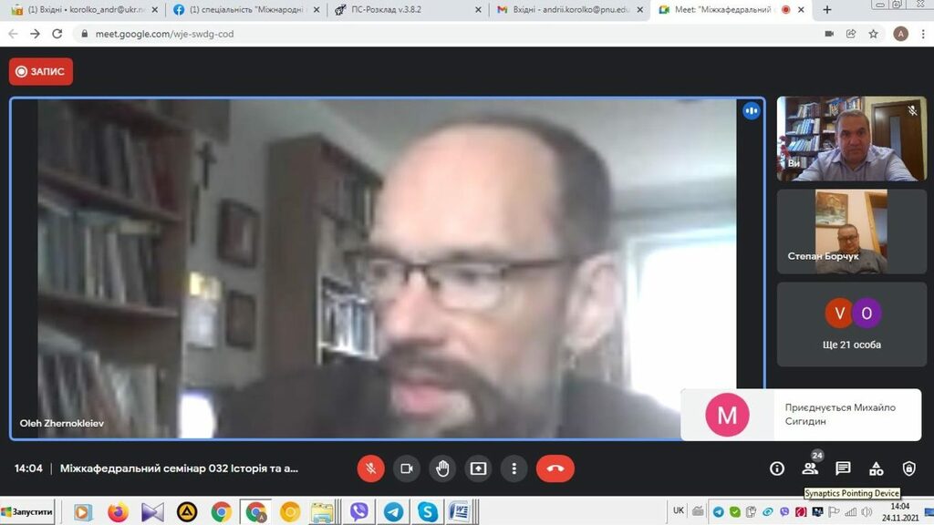 Відповідно до п. 14 Порядку проведення експерименту з присудження ступеня доктора філософії та наказів ректора Університету № 731–734 від 19 листопада 2021 р. «Про призначення складу фахового семінару», 24–25 листопада 2021 р. відбулися міжкафедральні фахові семінари кафедри всесвітньої історії та кафедри історії України і методики викладання історії для проведення попередніх експертиз дисертацій випускників аспірантури Прикарпатського національного університету імені Василя Стефаника: Іванчука Василя Петровича, тема дисертації «Померлі в обрядах і віруваннях кінця ХІХ – початку ХХІ століття (на матеріалах Гуцульщини)» (науковий керівник – кандидат історичних наук, доцент кафедри етнології і археології Костючок П.С.); Кавацюка Дмитра Івановича, тема дисертації – «Українське представництво Галичини в австрійському парламенті (1861–1897 рр.)» (науковий керівник – доктор історичних наук, професор, завідувач кафедри історії України і методики викладання історії Райківський І.Я.); Лизеня Євгена Володимировича, тема дисертації – «Миротворчі місії під час польсько-української війни 1918–1919 рр.» (науковий керівник – доктор історичних наук, професор кафедри всесвітньої історії Борчук С.М.); а також здобувача науково-освітнього ступеня кафедри історії та культури України ДВНЗ «Університет Григорія Сковороди в Переяславі» Стеценка Володимира Івановича, тема дисертації – «Діяльність цензурних органів в українських губерніях (1905–1907 рр.)» (науковий керівник – доктор історичних наук, професор кафедри методики викладання суспільних дисциплін і гендерної освіти Національного педагогічного університету імені М.П. Драгоманова). Головував на засіданні фахового семінару завідувач випускової кафедри всесвітньої історії доктор історичних наук, професор Жерноклеєв О.С.