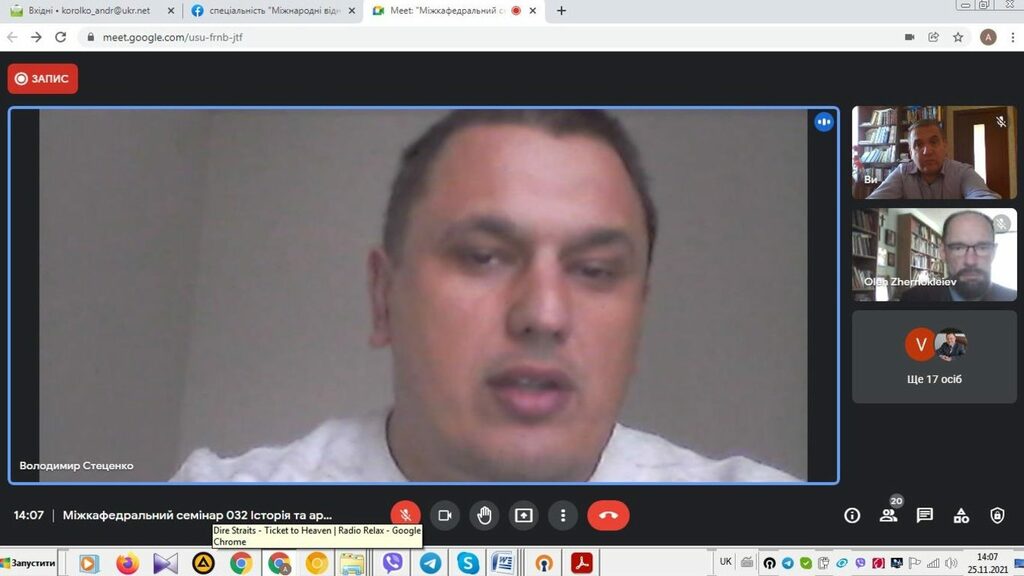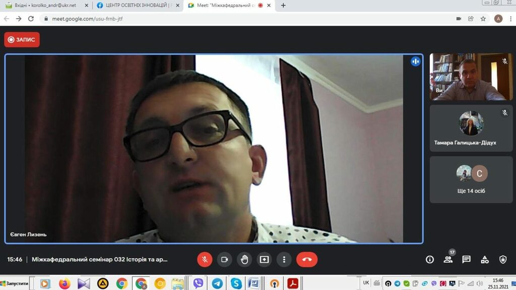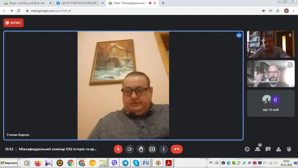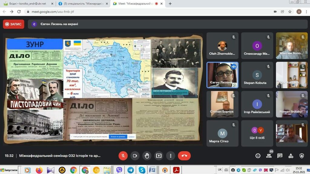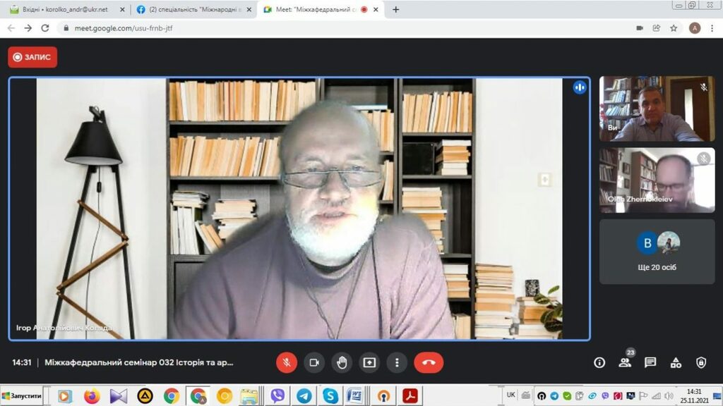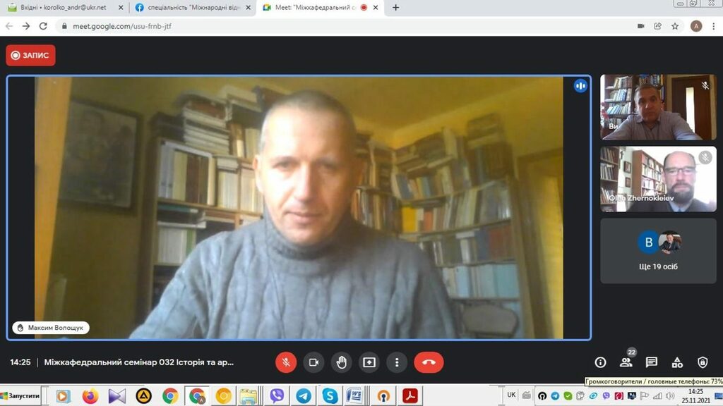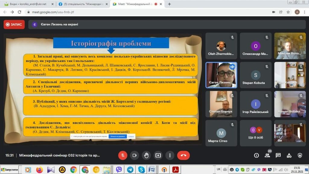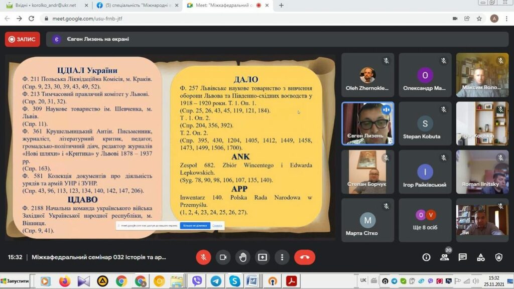 Відповідно до п. 14 Порядку проведення експерименту з присудження ступеня доктора філософії та наказів ректора Університету № 731–734 від 19 листопада 2021 р. «Про призначення складу фахового семінару», 24–25 листопада 2021 р. відбулися міжкафедральні фахові семінари кафедри всесвітньої історії та кафедри історії України і методики викладання історії для проведення попередніх експертиз дисертацій випускників аспірантури Прикарпатського національного університету імені Василя Стефаника: Іванчука Василя Петровича, тема дисертації «Померлі в обрядах і віруваннях кінця ХІХ – початку ХХІ століття (на матеріалах Гуцульщини)» (науковий керівник – кандидат історичних наук, доцент кафедри етнології і археології Костючок П.С.); Кавацюка Дмитра Івановича, тема дисертації – «Українське представництво Галичини в австрійському парламенті (1861–1897 рр.)» (науковий керівник – доктор історичних наук, професор, завідувач кафедри історії України і методики викладання історії Райківський І.Я.); Лизеня Євгена Володимировича, тема дисертації – «Миротворчі місії під час польсько-української війни 1918–1919 рр.» (науковий керівник – доктор історичних наук, професор кафедри всесвітньої історії Борчук С.М.); а також здобувача науково-освітнього ступеня кафедри історії та культури України ДВНЗ «Університет Григорія Сковороди в Переяславі» Стеценка Володимира Івановича, тема дисертації – «Діяльність цензурних органів в українських губерніях (1905–1907 рр.)» (науковий керівник – доктор історичних наук, професор кафедри методики викладання суспільних дисциплін і гендерної освіти Національного педагогічного університету імені М.П. Драгоманова). Головував на засіданні фахового семінару завідувач випускової кафедри всесвітньої історії доктор історичних наук, професор Жерноклеєв О.С.