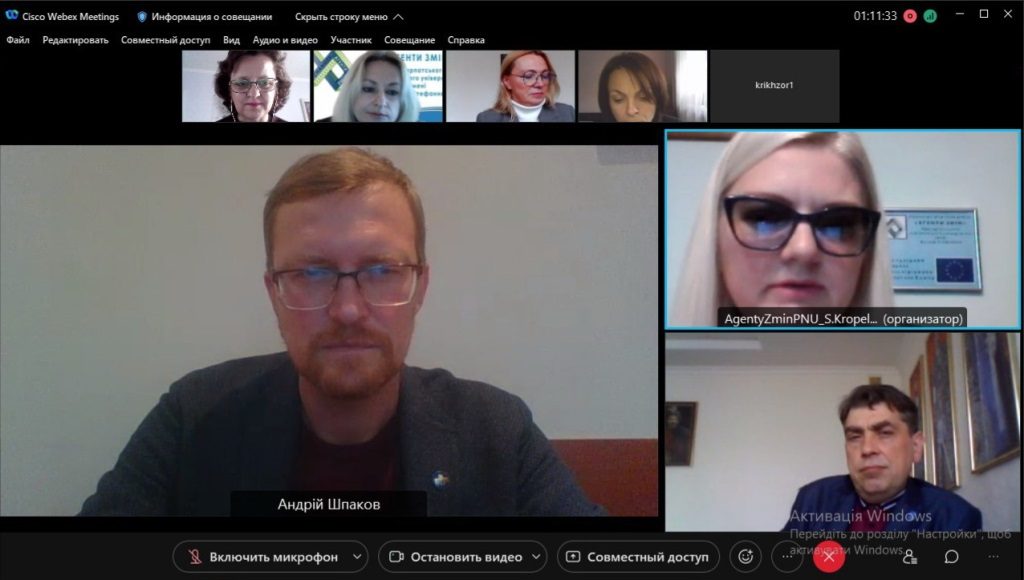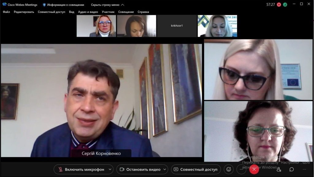 В онлайн-заході взяли участь представники Черкаського національного університету імені Богдана Хмельницького – проректор з наукової, інноваційної та міжнародної діяльності Сергій Корновенко, директорка Центру зовнішніх та міжнародних зв’язків Тамара Качала, проректор з навчально-методичної роботи Київського національного університету будівництва і архітектури – Андрій Шпаков, директорка Проєктно-освітнього центру «Агенти змін» Прикарпатського національного університету імені Василя Стефаника, доцентка кафедри фінансів Світлана Кропельницька та фахівчині Центру – доцентки кафедри фінансів Зоряна Криховецька, Тетяна Мигович, Тетяна Солоджук та доцентка кафедри загальної і клінічної психології Мирослава Кулеша-Любінець.