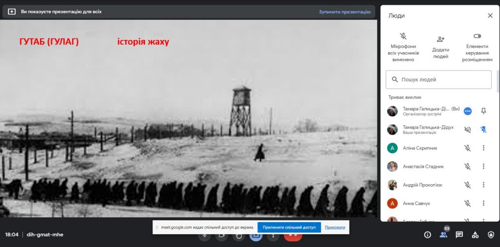 10 грудня 2021 р. доцент кафедри історії України і методики викладання історії Тамара Галицька-Дідух провела для студентів першого і четвертого курсів спеціальності 014 Середня освіта (Історія) ОР «Бакалавр» виховний захід «ГУТАБ (ГУЛАГ(sad): історія жаху». Під час пізнавальної бесіди Читати далі