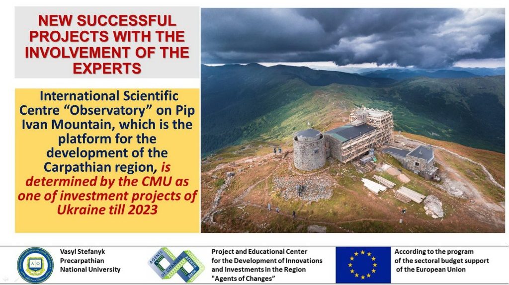 Доцентка Світлана Кропельницька звернула увагу також на ще один успішний проєкт Прикарпатського національного університету імені Василя Стефаника – створення Міжнародного наукового центру «Обсерваторія» на г. Піп Іван, який реалізується за координації ректора Університету, професора Ігоря Цепенди. Фахівці-фінансисти з команди АГЕНТІВ ЗМІН Університету мають нагоду долучитись до продовження розробки проєкту, його формування як платформи розвитку Карпатського регіону, завдяки чому проєкт включено до сотні пріоритетних інвестиційних проєктів України. У ході виступу Світлана Кропельницька акцентувала увагу на проєкті відбудови Обсерваторії, оскільки мала нагоду під час стажування у США у 2017 р. побувати з візитом у GRIFFITH OBSERVATORY, що знаходиться у Південній Каліфорнії (Support – Griffith Observatory – Southern California’s gateway to the cosmos!).