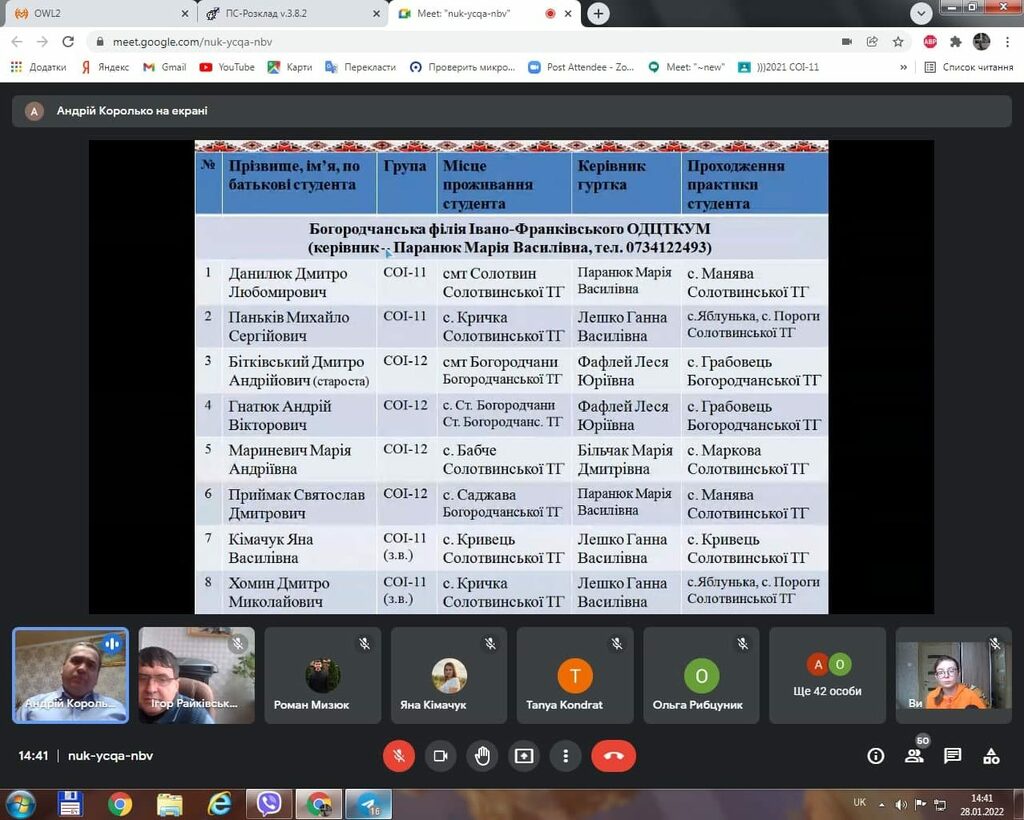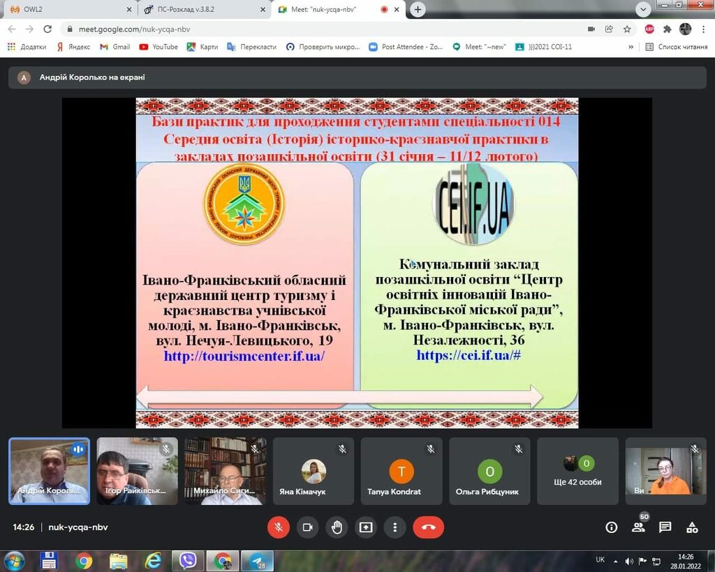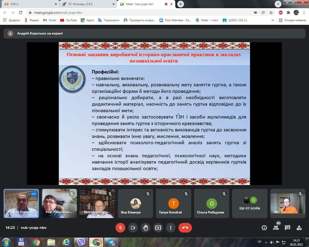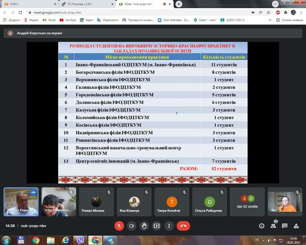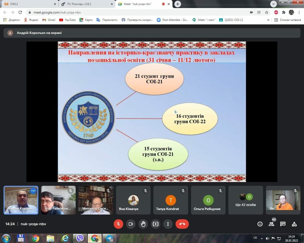 28 січня 2022 р. за допомогою сервісу організації конференцій Google Meet відбулася настановча нарада з організації проведення виробничої історико-краєзнавчої практики в закладах позашкільної освіти для студентів ІІ курсу спеціальності 014 Середня освіта (Історія) ОР «Бакалавр» (денна і заочна форма навчання). Вона спрямована на конкретну професіоналізацію та збільшує можливості самореалізації майбутніх керівників гуртків та учителів, є містком для формування в майбутніх керівників гурткової роботи і учителів педагогічних вмінь і навичок, що сприяють розвиткові професійних якостей педагога, потреби в педагогічній самоосвіті.