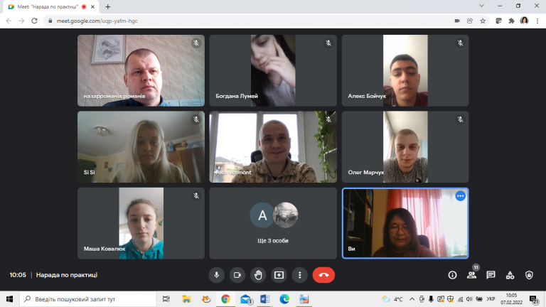 7 лютого 2022 р. за допомогою сервісу організації конференцій Google Meet відбулася настановча нарада з організації проведення навчальної практики в засобах масової інформації для студентів ІІ курсу та виробничої практика у політичних партіях студентів ІІІ курсу спеціальності 052 Читати далі