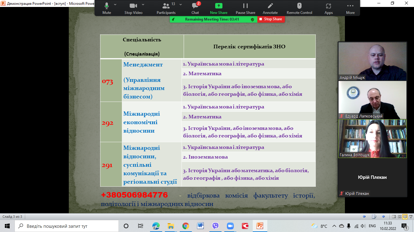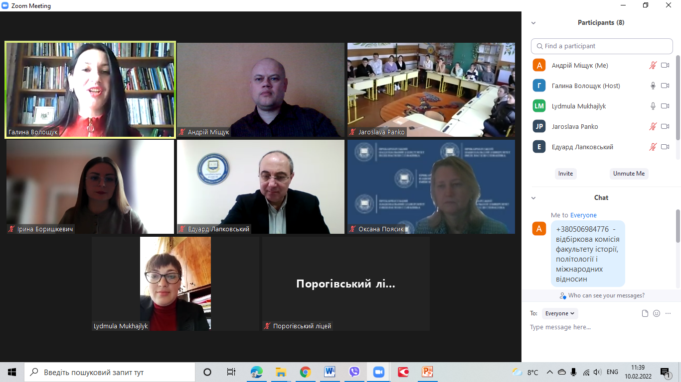 Під час онлайн зустрічі провідний фахівець з профорієнтації Галина Волощук, відповідальний секретар Приймальної комісії Прикарпатського національного університету імені Василя Стефаника Едуард Лапковський, відповідальний секретар відбіркової комісії Факультету історії, політології і міжнародних відносин Андрій Міщук Іванович та інші викладачі закладу вищої освіти ознайомили присутніх з умовами Вступу 2022 року до Університету та зокрема на освітні програми Факультету історії, політології і міжнародних відносин.