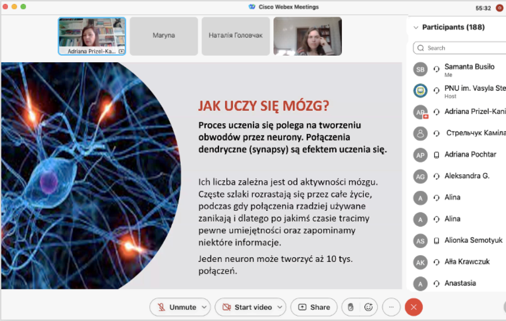 Лекція докторки Адріани Прізел-Кані (Яґєллонский університет) зібрала майже 200 учасників. Це – студенти, викладачі та вчителі з академічних центрів України. Відкрита лекція на тему: «Як вчиться мозок?» була присвячена нейробіологічним процесам у контексті вивчення іноземних мов. Лекторка, докторка Адріана Прізел-Каня є асистенткою Інституту польських студій Ягеллонського університету, випускниця полоністики та логопедії, авторка багатьох наукових статей у галузі глотодидактики, підручників для викладання польської мови, а також монографії про розвиток навичок розуміння на слух (2012).