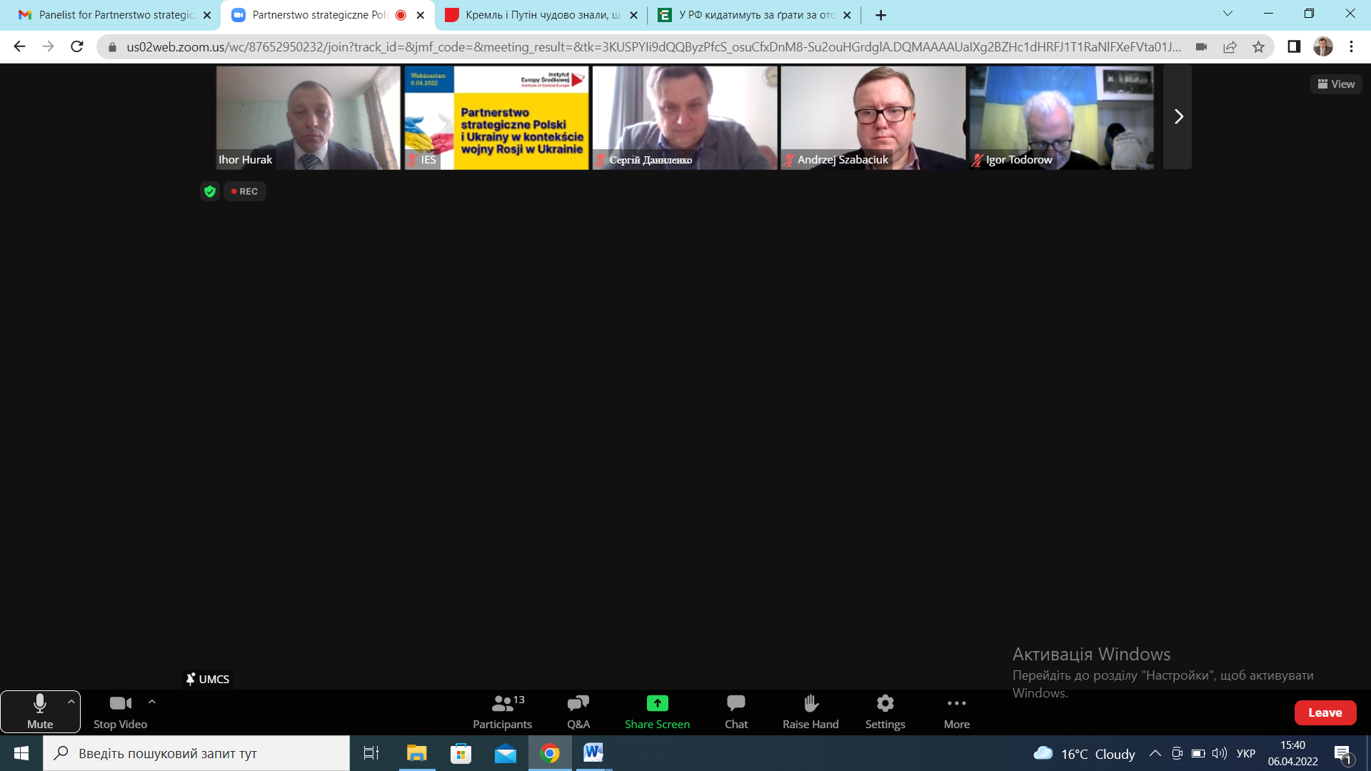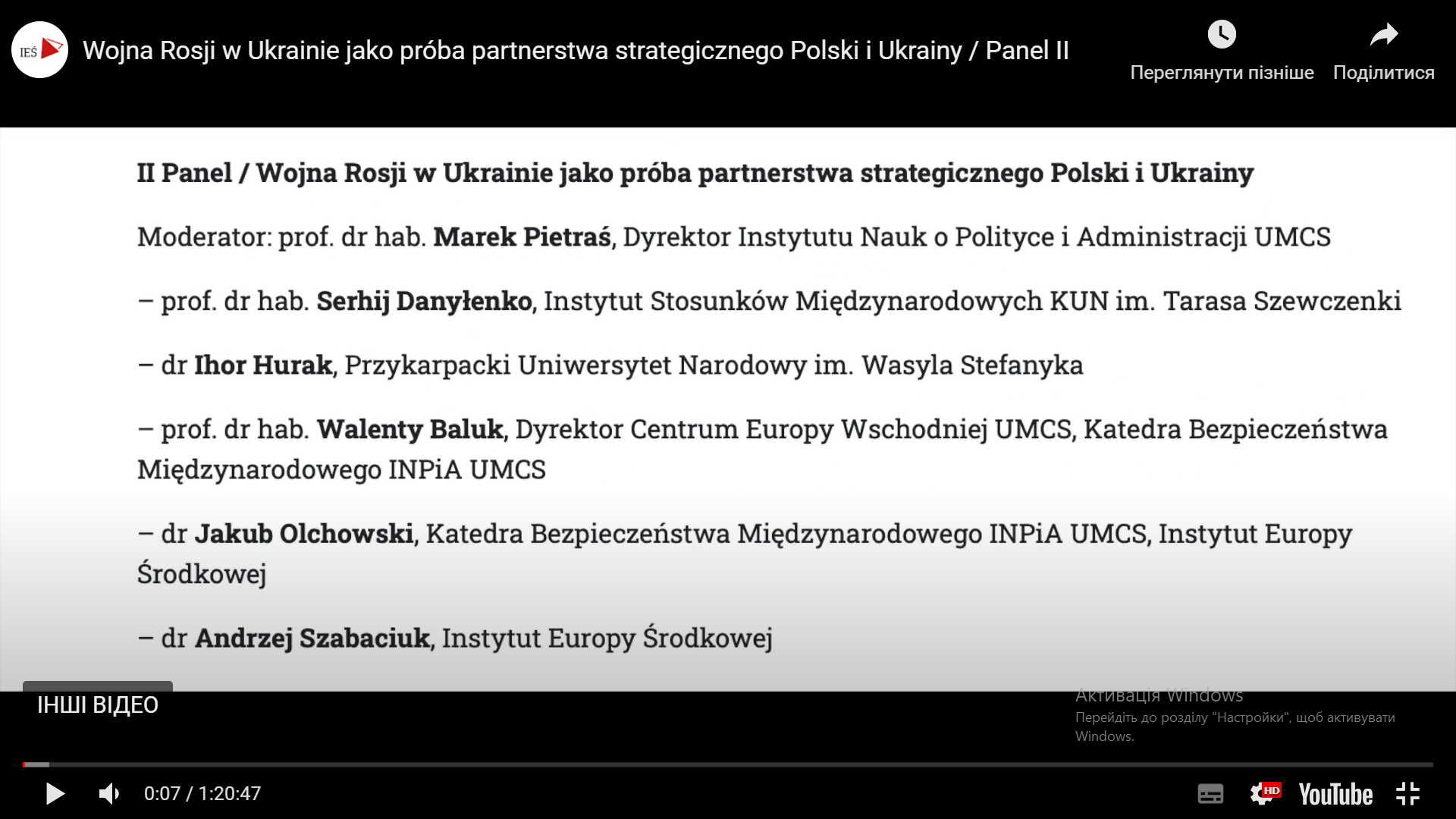 6 квітня 2022 р. з ініціативи керівництва Інституту Центральної Європи та факультету політології та журналістики Університету Марії Кюрі-Склодовської у м. Любліні (Республіка Польща) відбувся міжнародний науковий вебінар на тему «Стратегічне партнерство Польщі та України в контексті війни Росії в Україні». З української сторони у заході взяли участь науковці Київського національного університету імені Тараса Шевченка, Прикарпатського національного університету імені Василя Стефаника, Ужгородського національного університету, Чернівецького національного університету імені Юрія Федьковича.