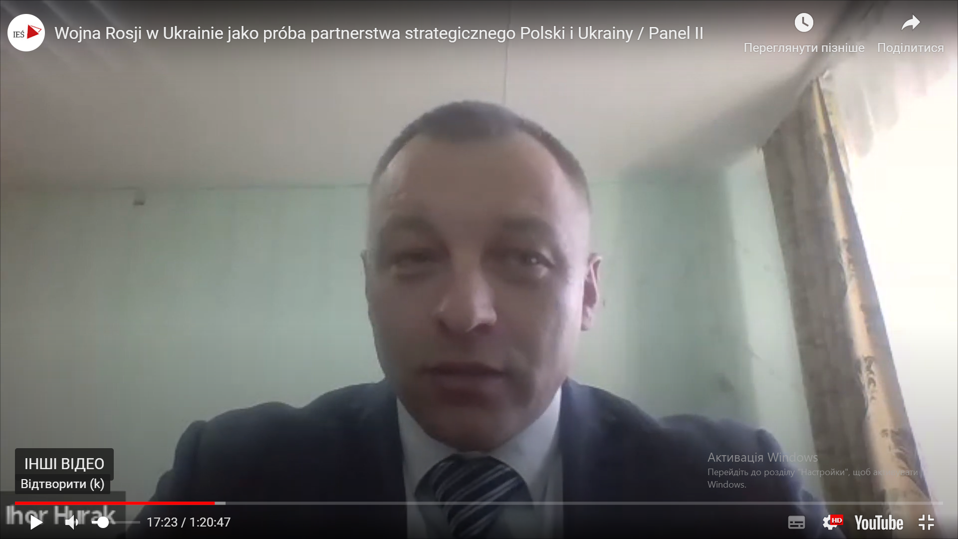 Наш університет в рамках вебінару представляв доцент кафедри міжнародних відносин Ігор Гурак. В рамках секції «Війна Росії в Україні як спроба верифікації стратегічного партнерства Польщі та України» викладач кафедри міжнародних відносин акцентував увагу на місці польської держави у зовнішній політиці України у переломні періоди нашої сучасної історії. Зокрема, він зазначив, що в ході Помаранчевої революції, Революції гідності польське керівництво та пересічні громадяни Республіки Польща надавали вагому практичну підтримку нашій державі. Далі доповідач звернув увагу, що подібну ситуацію ми спостерігаємо з початку 2022 р. Так, починаючи з січня, в контексті погіршення безпекової ситуації навколо України можна відстежити поглиблення співпраці між офіційними Києвом та Варшавою. Це мало своїм результатами масштабну та різнопланову допомогу зі сторони Польщі як для українців, які змушені були виїхати за межі нашої держави, так і для тих хто залишився, щоб чинити опір російській агресії. Доцент Ігор Гурак також відзначив, що польські експерти та політики традиційно критично оцінювали зовнішню політику очільників Кремля, особливо щодо країн так званого «близького зарубіжжя». Це викликало не тільки звинувачення у русофобстві зі сторони Росії, але і негативні коментарі з боку провідних західноєвропейських лідерів. В кінцевому підсумку, широкомасштабна російська агресія проти України продемонструвала, що власне саме польські оцінки були цілком адекватні та абсолютно виправдані.