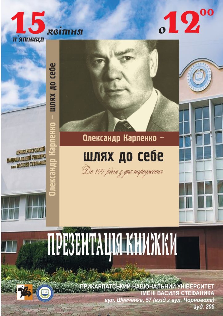 15 квітня 2022 р. у п’ятницю о 12.00 год. у Прикарпатському національному університеті імені Василя Стефаника в ауд. 205 (вхід з вул. Чорновола) відбудеться презентація книги «Олександр Карпенко – шлях до себе. До 100-річчя з дня народження». Читати далі