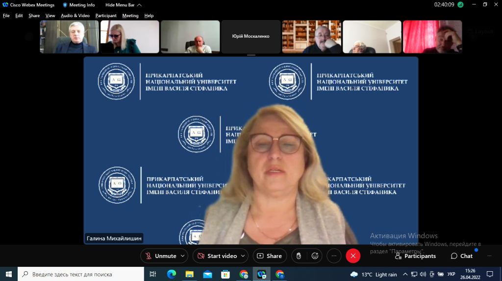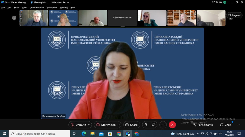 Про низку питань з наукової діяльності Університету поінформувала професорсько-викладацький склад проректорка з наукової роботи, професорка Валентина Якубів. Під час онлайн-засідання члени колегіального органу також схвалили Положення про Центр колективного користування науковим обладнанням «Лабораторія нанотехнологій для матеріалознавства, енергетики та медицини», зміни до Положення про електронний фонд нормативно-правових документів Прикарпатського національного університету імені Василя Стефаника та Порядок розподілу навчальних дисциплін між науково-педагогічними працівниками кафедр Університету.