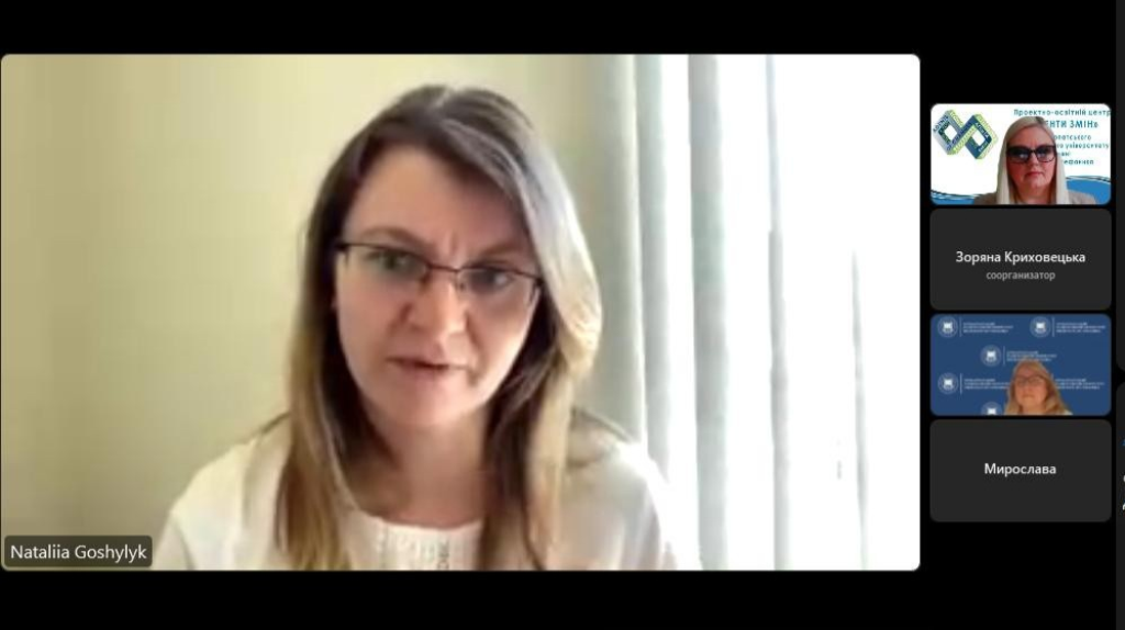 Родзинкою вебінару стала участь у прямому ефірі доцентки Прикарпатського національного університету імені Василя Стефаника, кандидатки філологічних наук, яка є на даний час стипендіаткою програми Fulbright Visiting Scholar 2021-2022, University of California, Berkeley Наталії Гошилик.