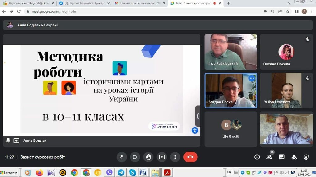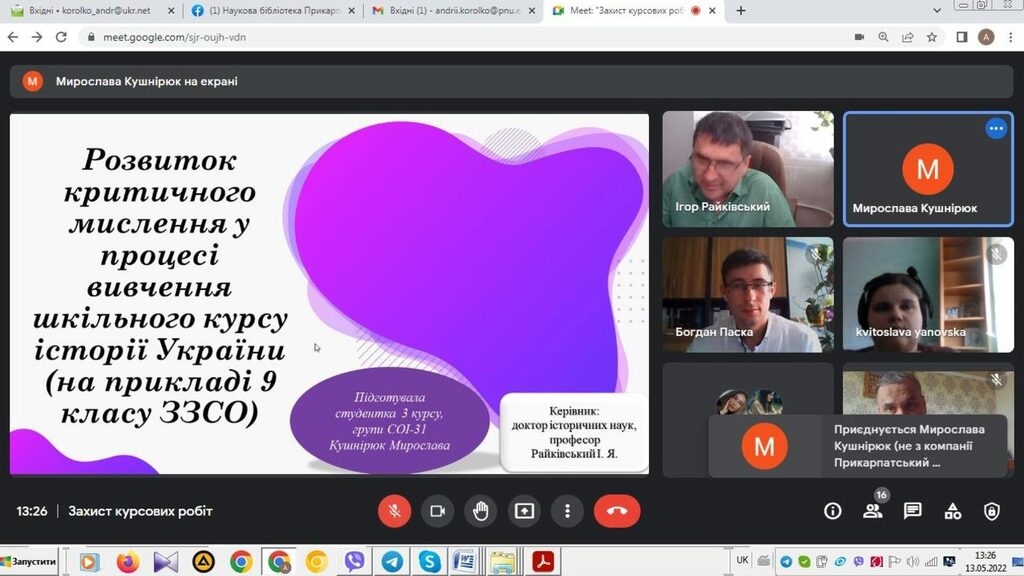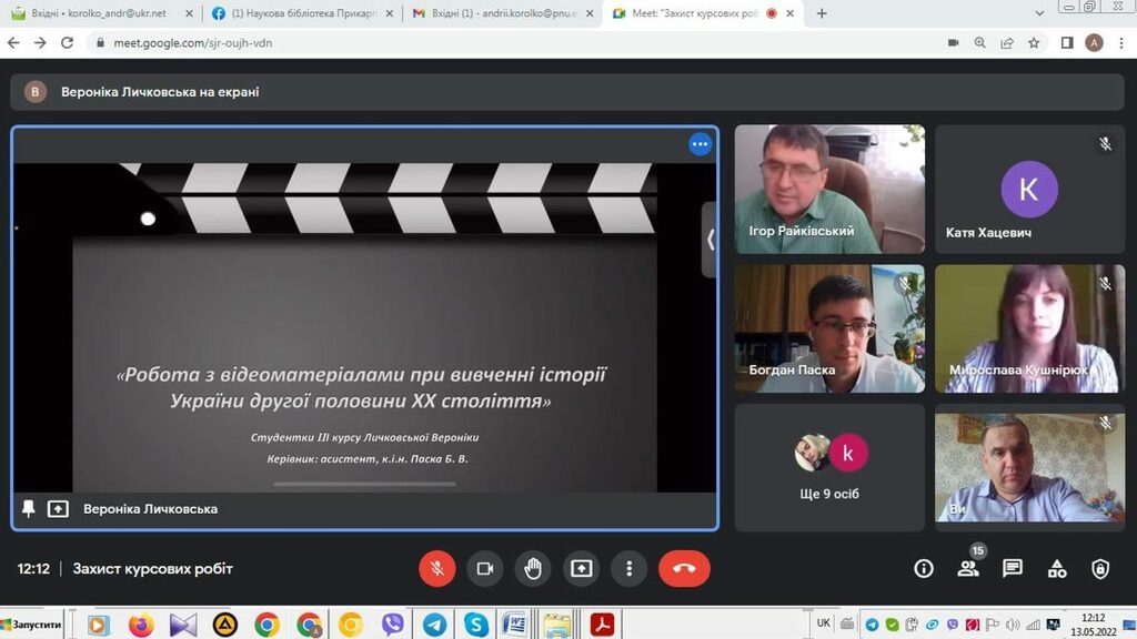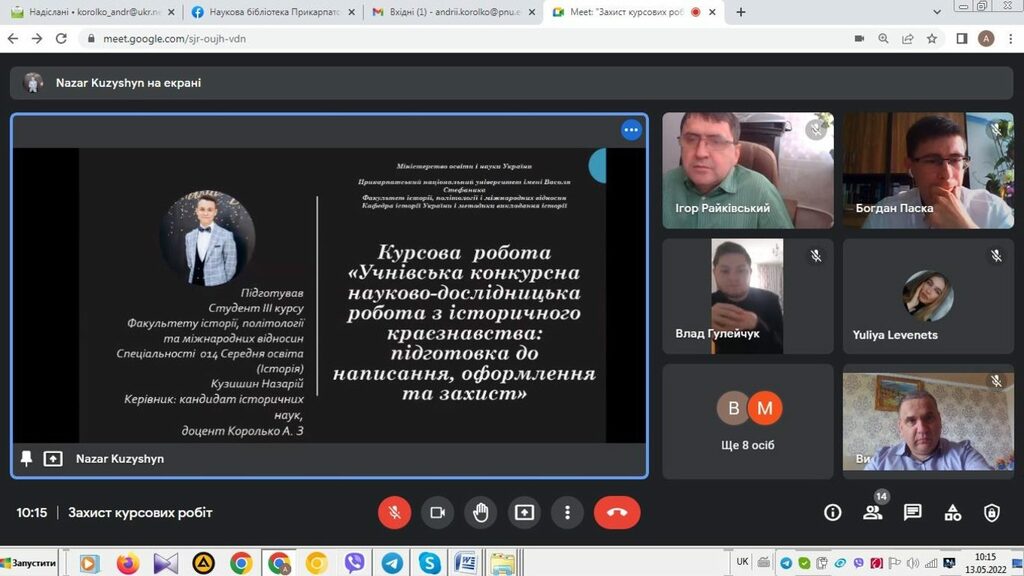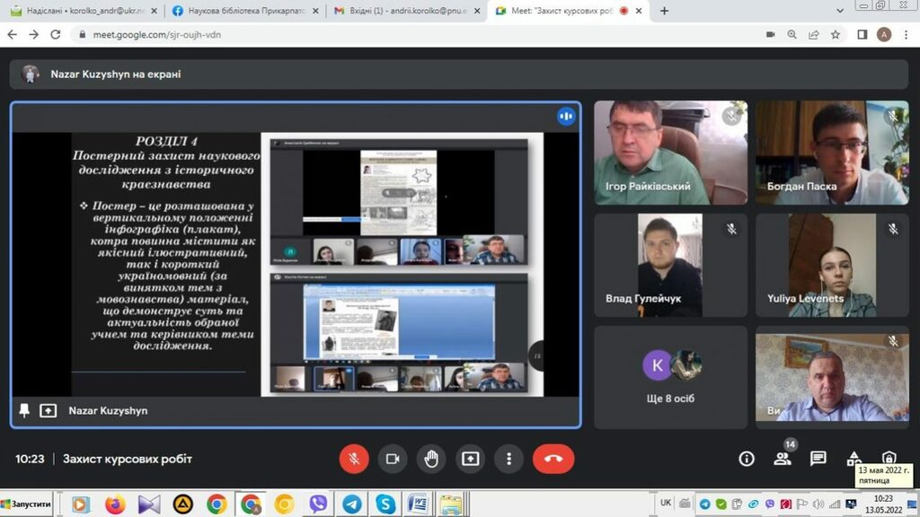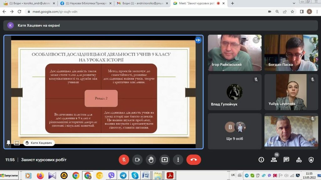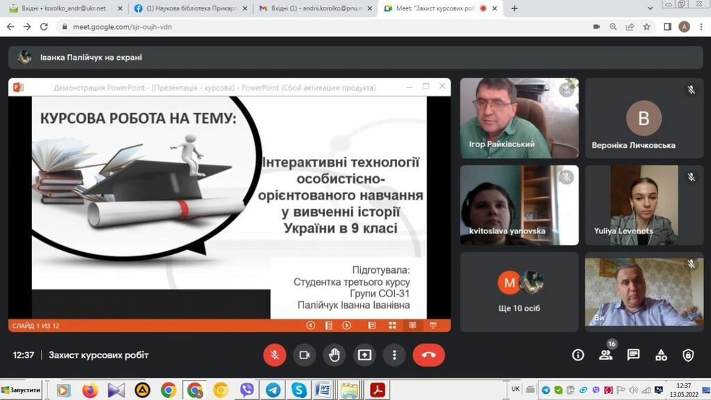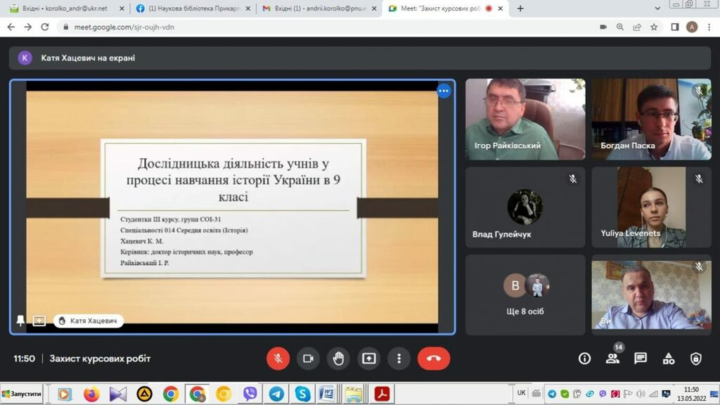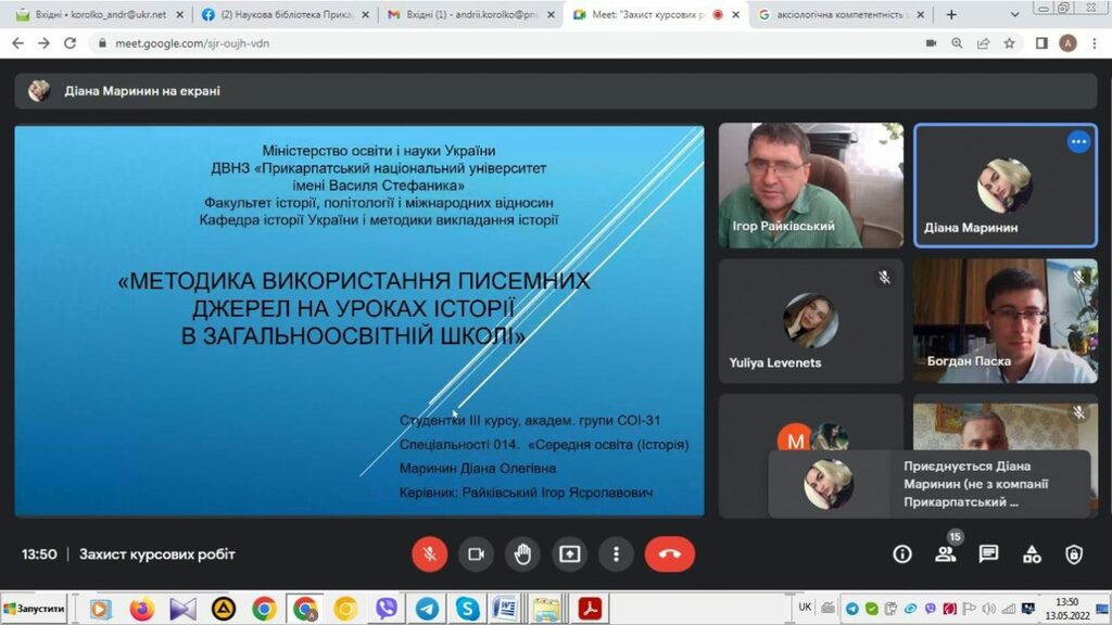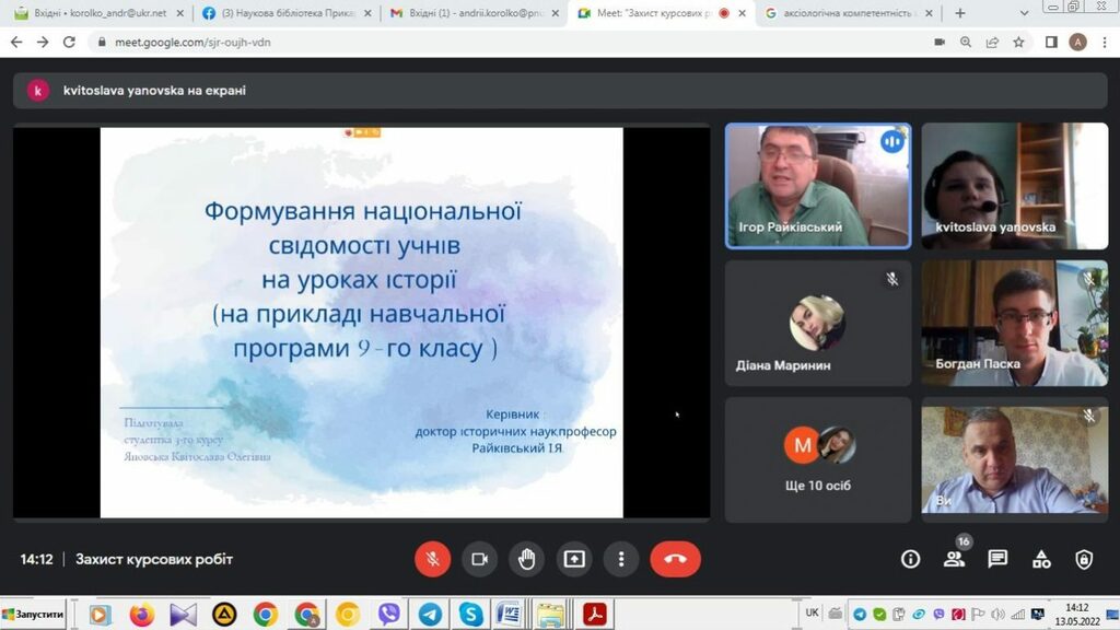 13 травня 2022 р. відбувся онлайн-захист курсових робіт студентів ІІІ курсу спеціальності 014 Середня освіта (Історія) ОР «Бакалавр» (денна форма навчання). В рамках захисту курсових робіт були сформовані три комісії. У своїх виступах під час захисту результатів своїх кваліфікаційних робіт з методики викладання історії і психолого-педагогічних дисциплін, організації краєзнавчої роботи у закладах загальної середньої освіти і закладах позашкільної освіти студенти звернули увагу на аргументованість вибору теми дослідження та її розкриття, підтвердили вільне володіння матеріалом, окреслили ступінь самостійності у виконанні роботи, визначили особистий внесок (наукову новизну) автора в роботу.