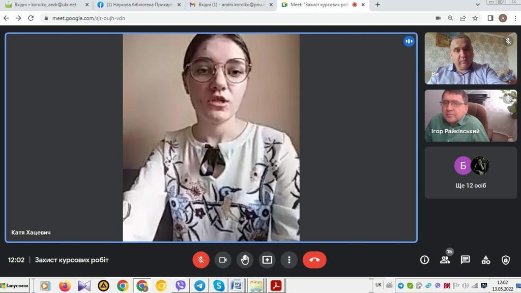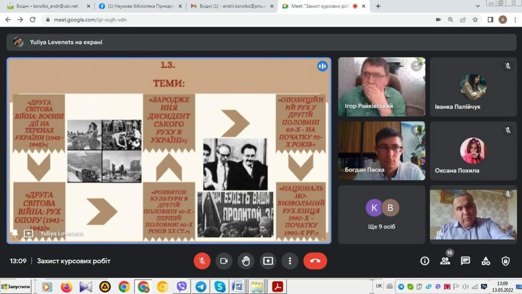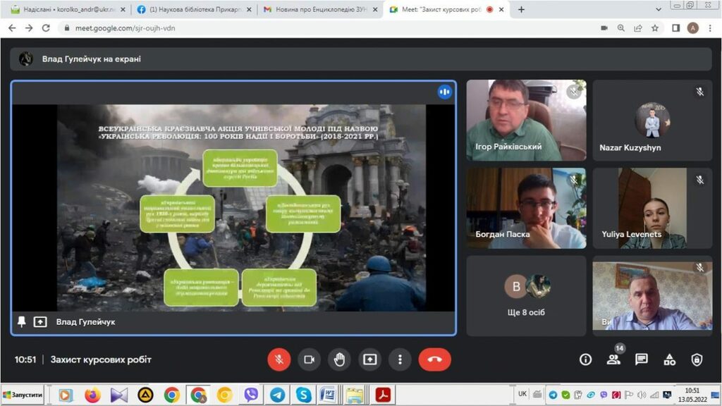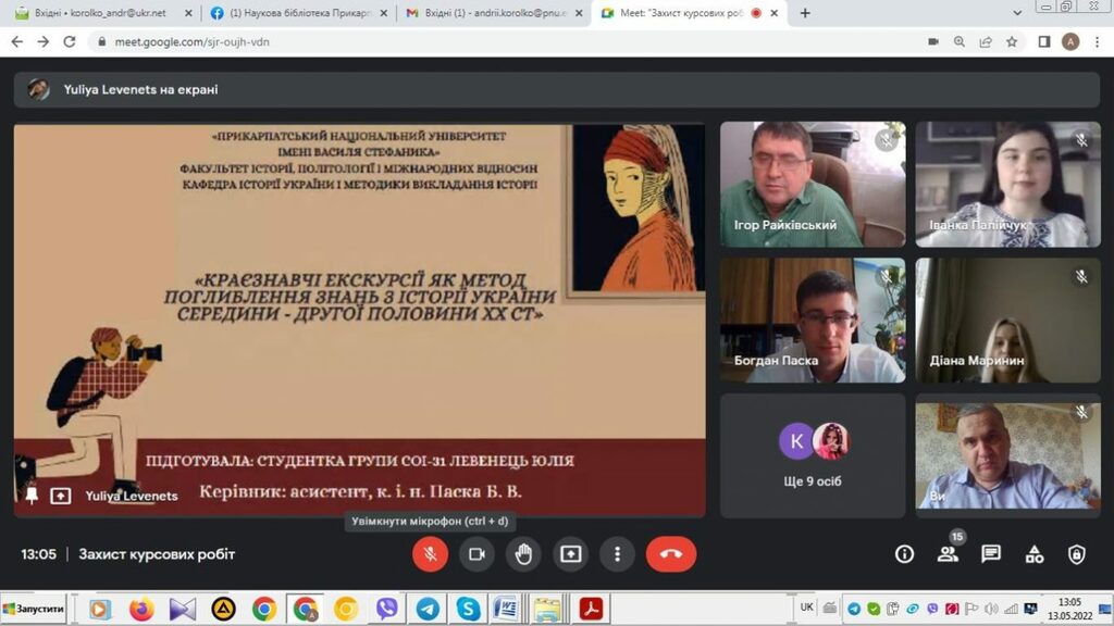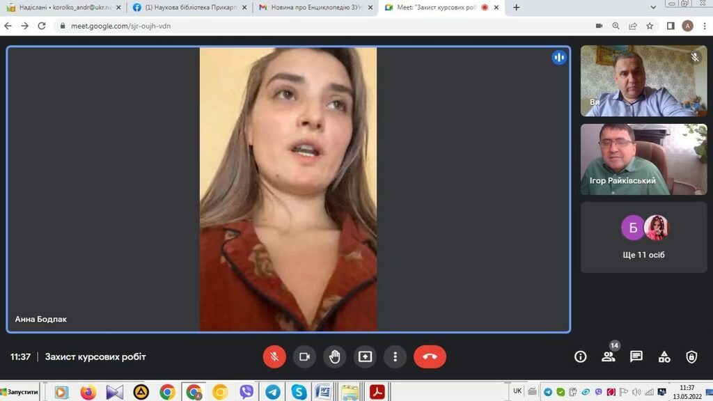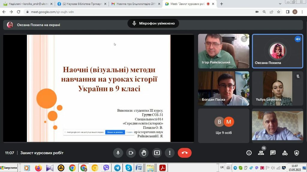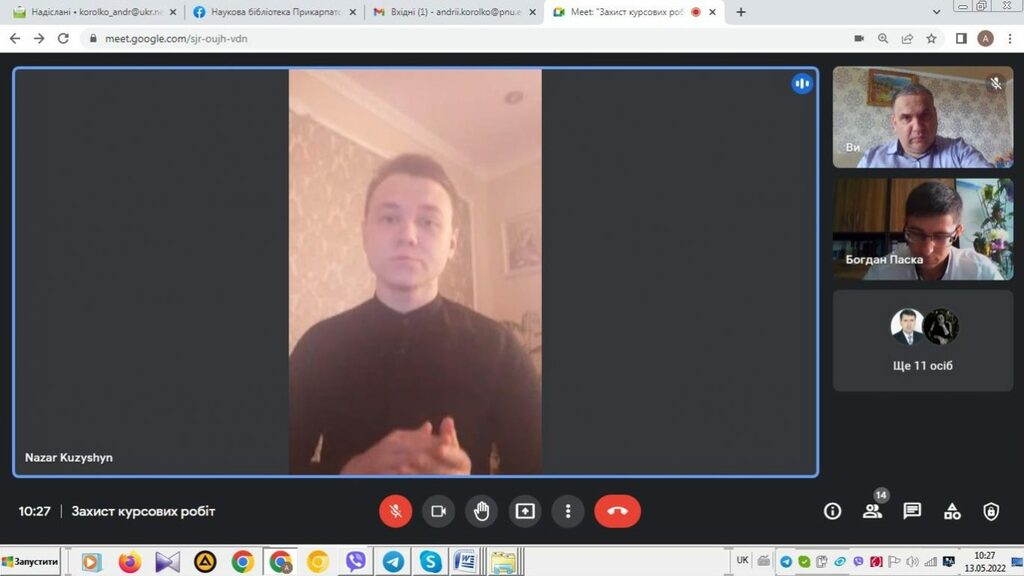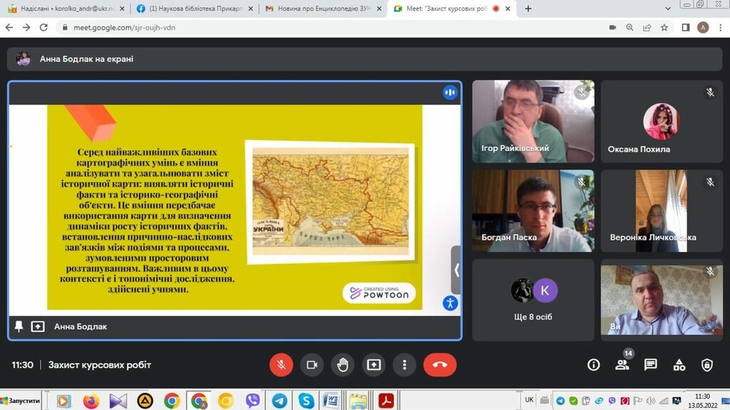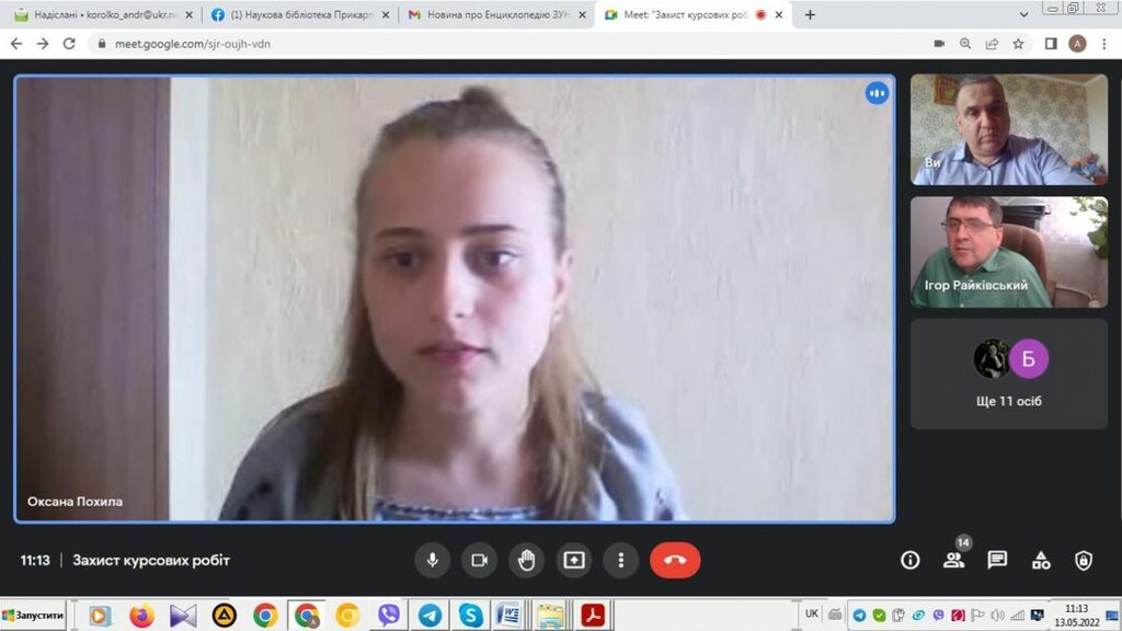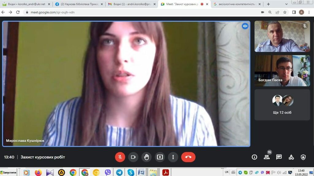 13 травня 2022 р. відбувся онлайн-захист курсових робіт студентів ІІІ курсу спеціальності 014 Середня освіта (Історія) ОР «Бакалавр» (денна форма навчання). В рамках захисту курсових робіт були сформовані три комісії. У своїх виступах під час захисту результатів своїх кваліфікаційних робіт з методики викладання історії і психолого-педагогічних дисциплін, організації краєзнавчої роботи у закладах загальної середньої освіти і закладах позашкільної освіти студенти звернули увагу на аргументованість вибору теми дослідження та її розкриття, підтвердили вільне володіння матеріалом, окреслили ступінь самостійності у виконанні роботи, визначили особистий внесок (наукову новизну) автора в роботу.