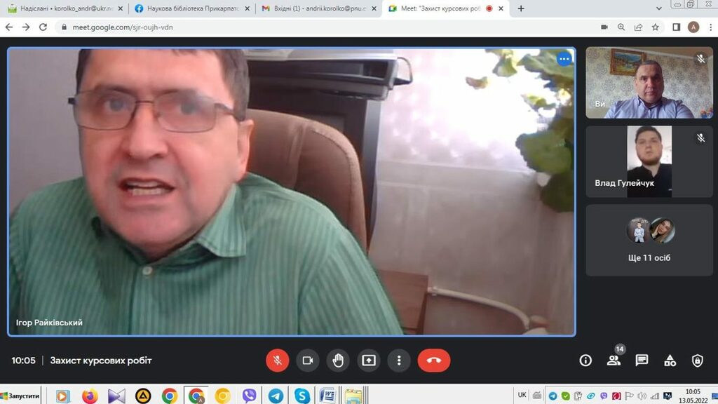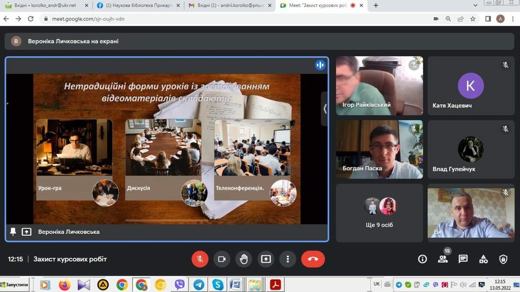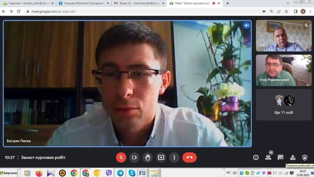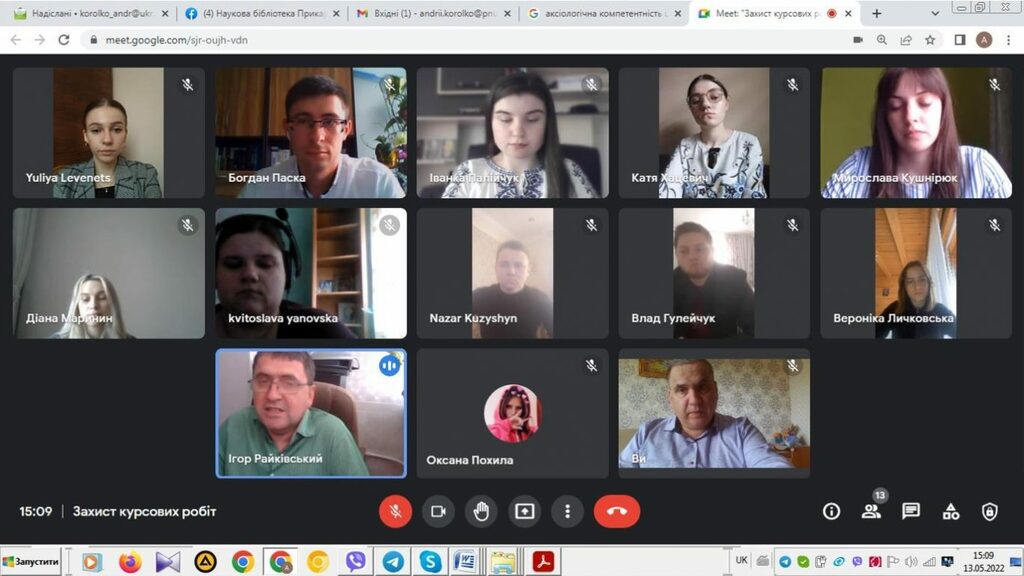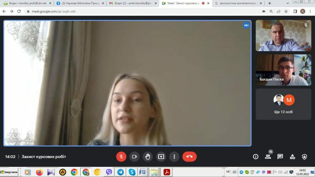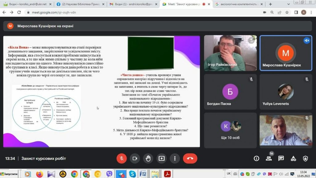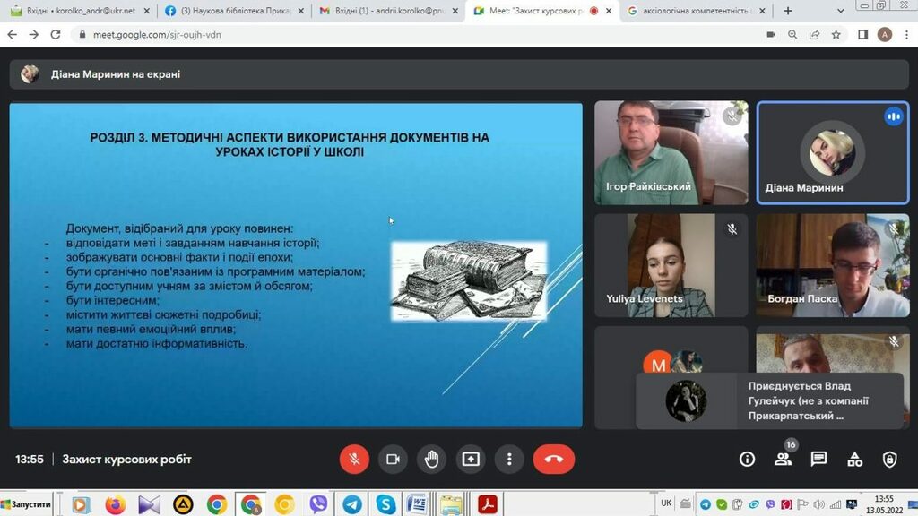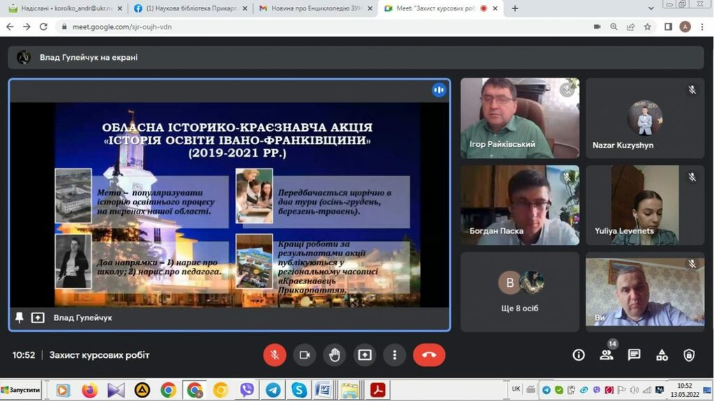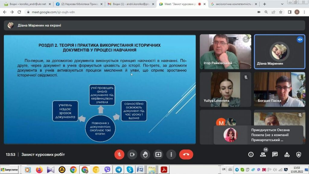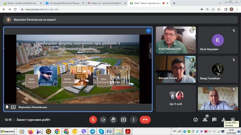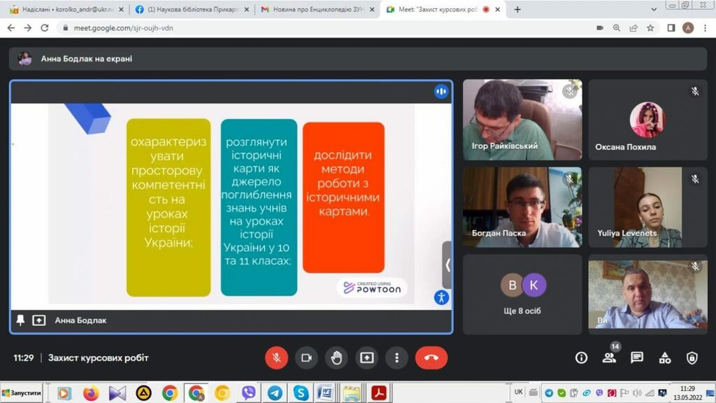 13 травня 2022 р. відбувся онлайн-захист курсових робіт студентів ІІІ курсу спеціальності 014 Середня освіта (Історія) ОР «Бакалавр» (денна форма навчання). В рамках захисту курсових робіт були сформовані три комісії. У своїх виступах під час захисту результатів своїх кваліфікаційних робіт з методики викладання історії і психолого-педагогічних дисциплін, організації краєзнавчої роботи у закладах загальної середньої освіти і закладах позашкільної освіти студенти звернули увагу на аргументованість вибору теми дослідження та її розкриття, підтвердили вільне володіння матеріалом, окреслили ступінь самостійності у виконанні роботи, визначили особистий внесок (наукову новизну) автора в роботу.