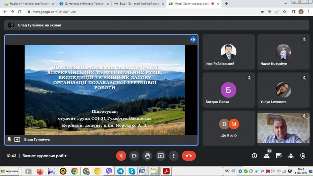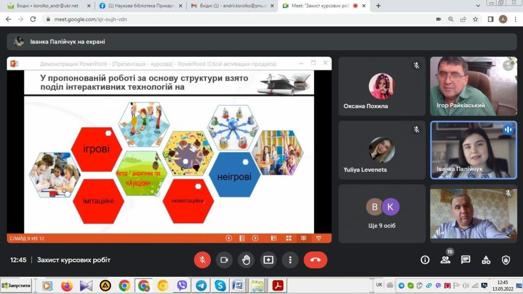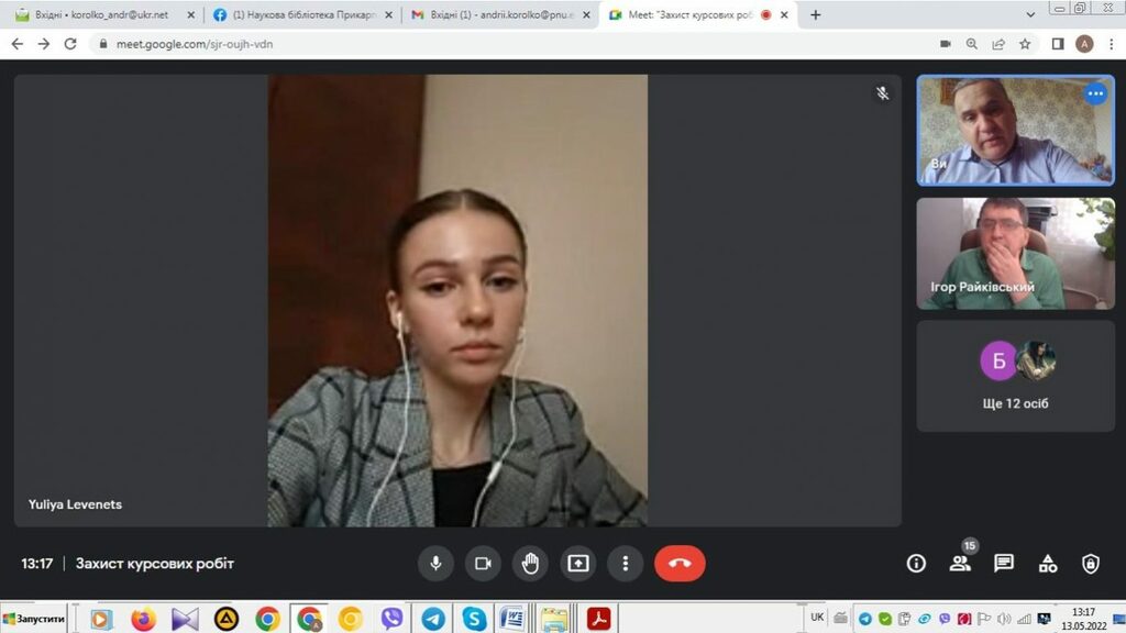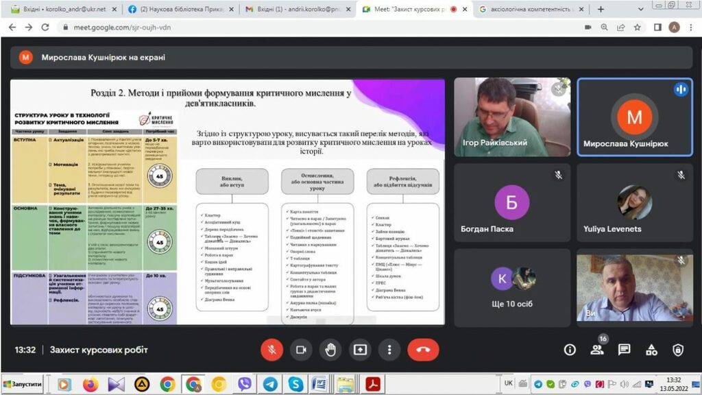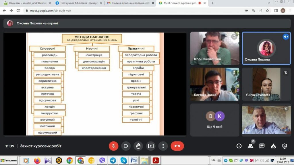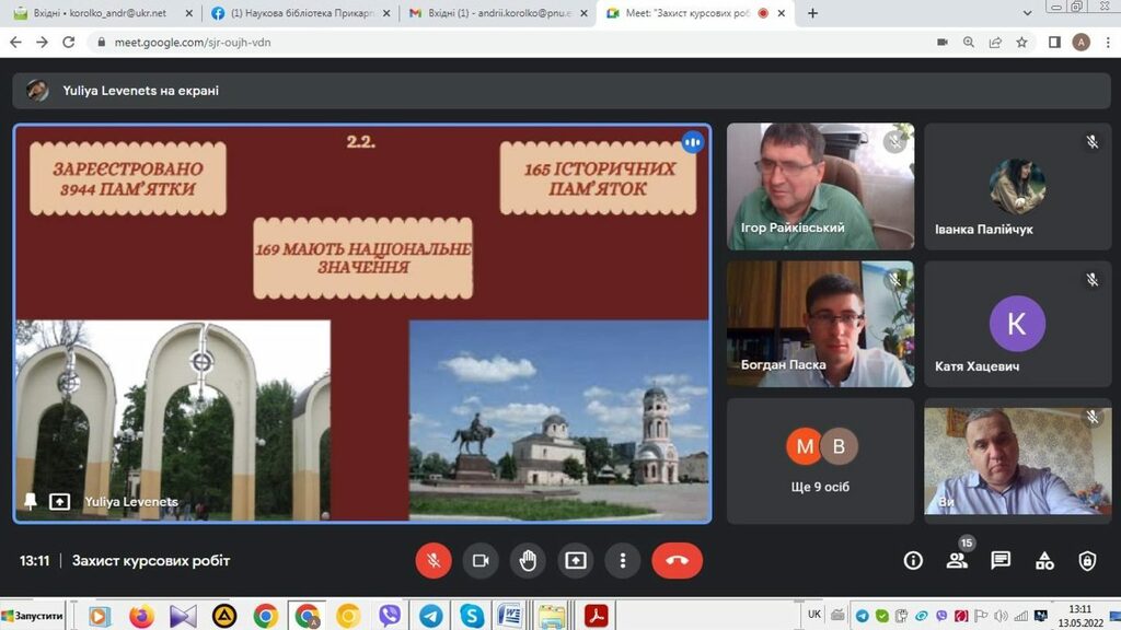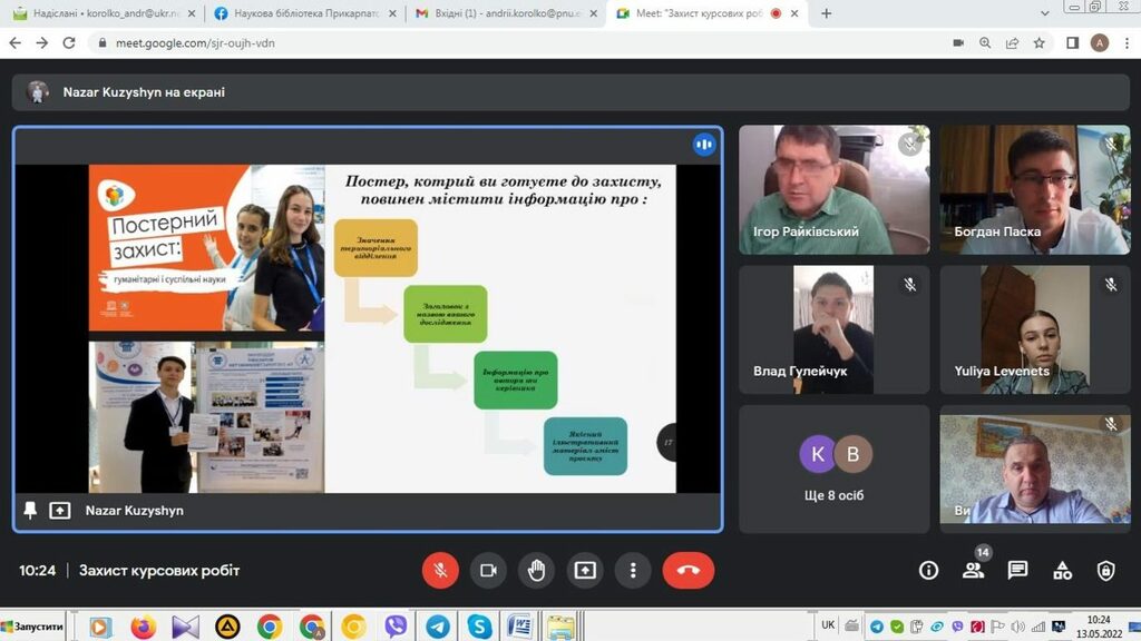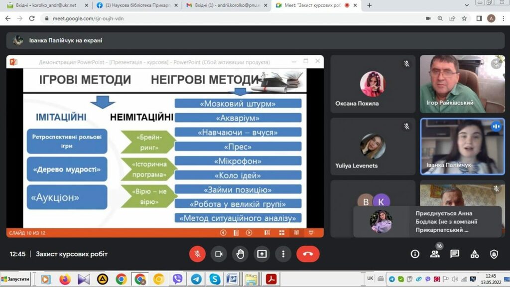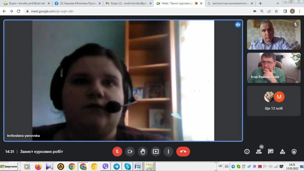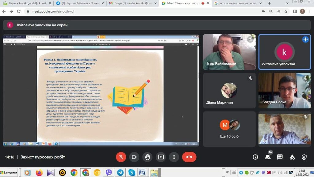 13 травня 2022 р. відбувся онлайн-захист курсових робіт студентів ІІІ курсу спеціальності 014 Середня освіта (Історія) ОР «Бакалавр» (денна форма навчання). В рамках захисту курсових робіт були сформовані три комісії. У своїх виступах під час захисту результатів своїх кваліфікаційних робіт з методики викладання історії і психолого-педагогічних дисциплін, організації краєзнавчої роботи у закладах загальної середньої освіти і закладах позашкільної освіти студенти звернули увагу на аргументованість вибору теми дослідження та її розкриття, підтвердили вільне володіння матеріалом, окреслили ступінь самостійності у виконанні роботи, визначили особистий внесок (наукову новизну) автора в роботу.