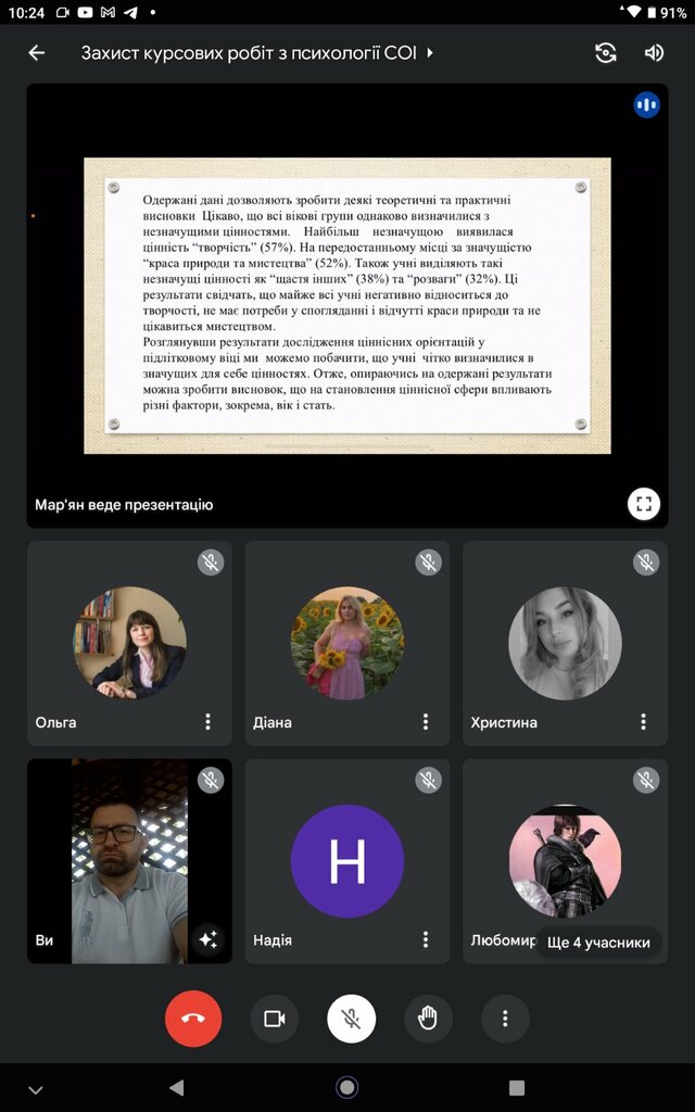Підготувавши візуалізовані презентації результатів своїх досліджень, студенти вміло вели себе під час захисту своїх робіт, показали чіткість, логічність, послідовність, лаконічність викладеного матеріалу. Разом з тим, спостерігалася компетентність, вичерпність відповідей молодих дослідників на запитання членів комісії, викладачів кафедри історії України і методики викладання історії та кафедри соціальної психології, своїх колег-студентів, а також етикет та культура спілкування учасників, активна кваліфікована участь у дискусії.