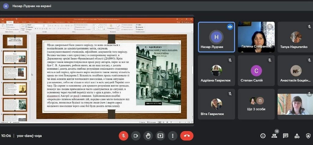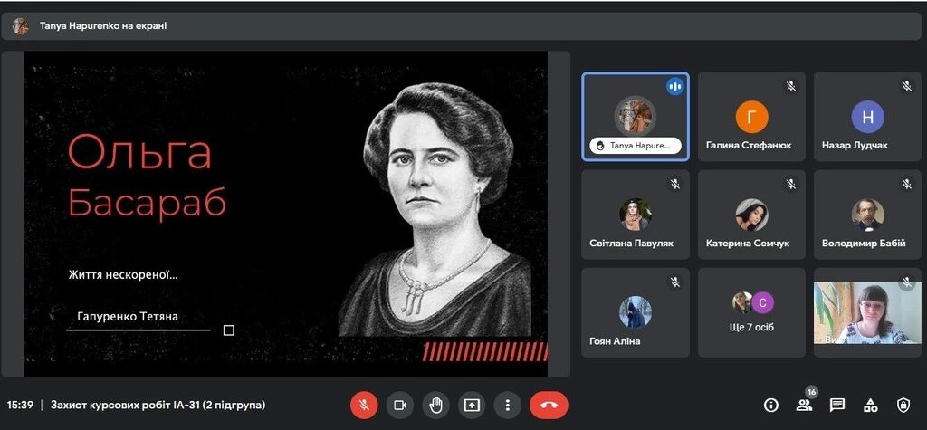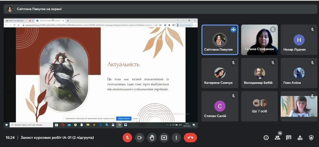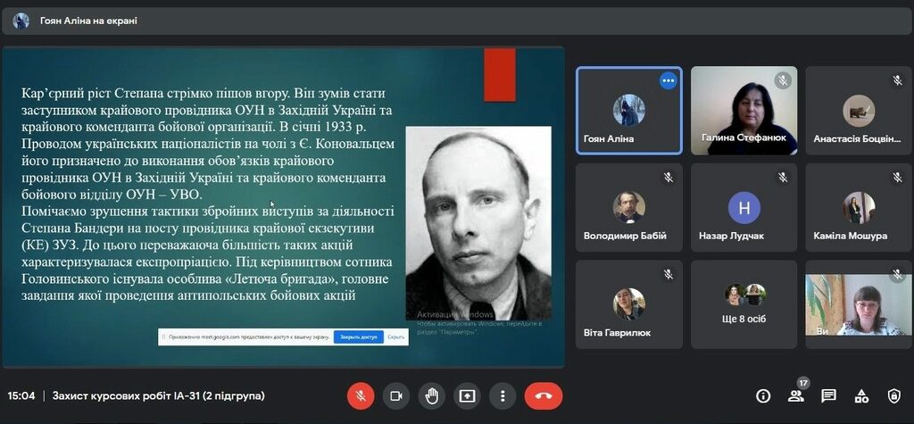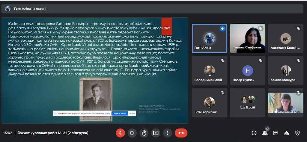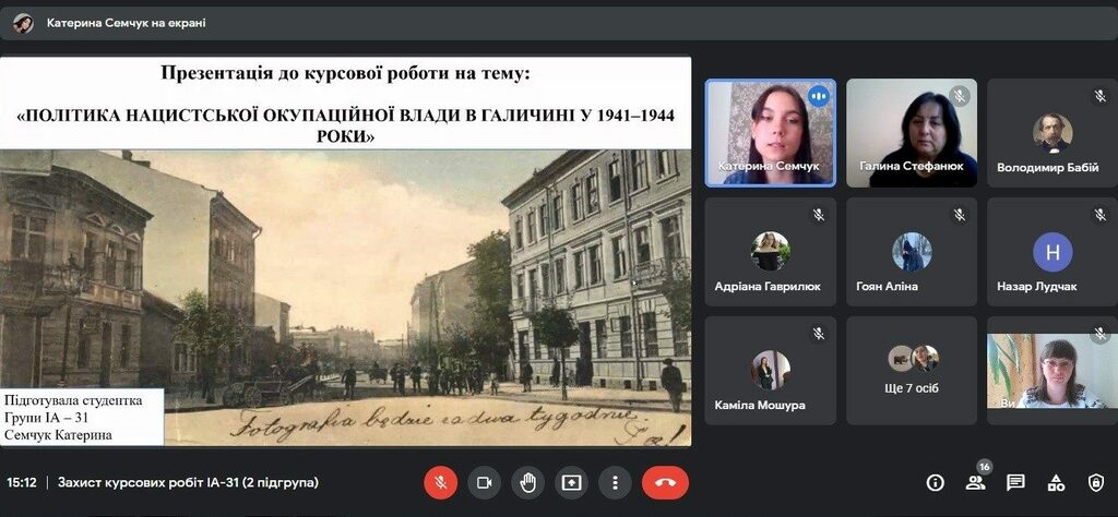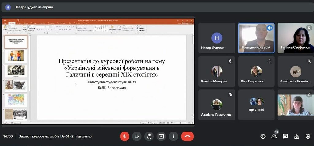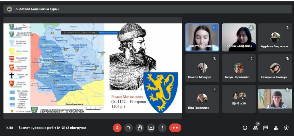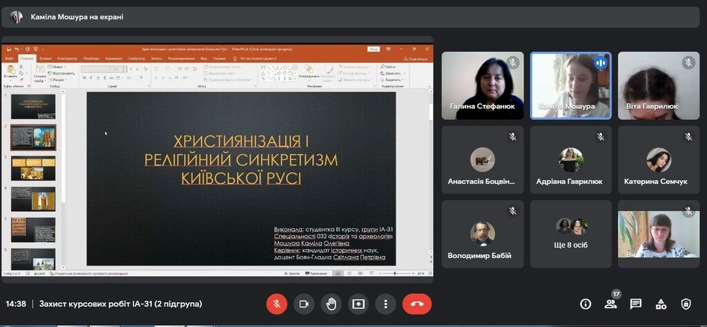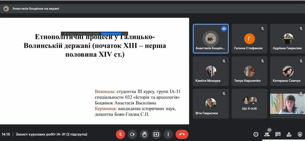 20 травня 2022 р. на платформі Goole Meet відбувся онлайн-захист курсових робіт студентів ІІІ курсу спеціальності 032 Історія та археологія ОР «Бакалавр» (денна форма навчання). До складу комісії, яка приймала захист 13 курсових робіт з історії України, ввійшли проф. Кугутяк М.В., доц. Боян-Гладка С.П. і доц. Стефанюк Г.В.
