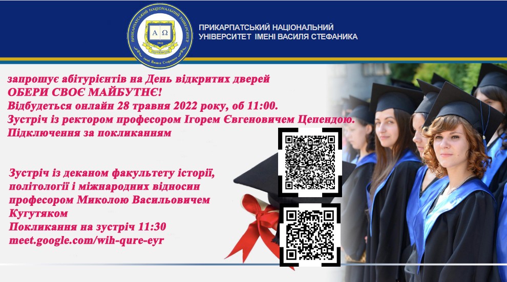 Прикарпатський національний університет імені Василя Стефаника запрошує на День відкритих дверей ОБЕРИ СВОЄ МАЙБУТНЄ! Відбудеться онлайн 28 травня 2022 р., об 11.00 год. зустріч із ректором, професором Ігорем Євгеновичем Цепендою. Зустріч із деканом Факультету історії, політології Читати далі
