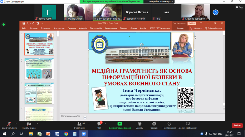 Зокрема, доктори педагогічних наук, професори кафедри педагогіки початкової освіти Марія Оліяр, Олена Будник, Інна Червінська започаткували дискусію про переваги та недоліки дистанційної освіти, розкрили проблеми цифрової трансформації освіти та науки в умовах війни, медіаграмотності як основи інформаційної безпеки в умовах воєнного стану. Докторка педагогічних наук, професорка, декан педагогічного факультету Херсонського державного університету Любов Петухова поділилася досвідом організації логістики освітніх бізнес-процесів в умовах окупації.