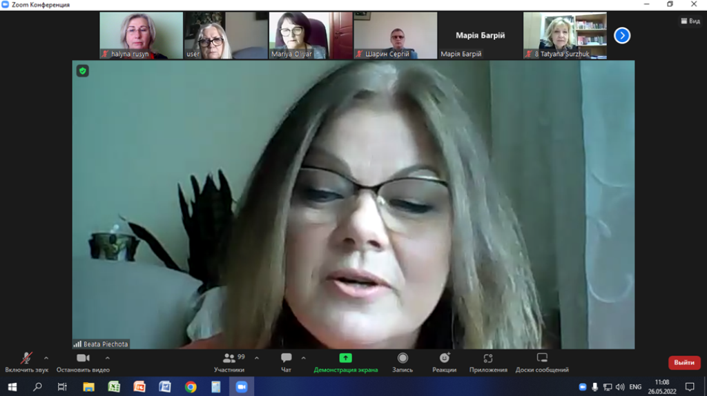 Докторка педагогіки, старша викладачка кафедри педагогіки Державної академії прикладних наук в м. Хелм (Республіка Польща) Halina Bejger розповіла про способи підтримки дітей, у тому числі українських переселенців, що перебувають у стані психологічної кризи, в польській системі освіти. До обговорення проблеми долучилися студенти Golczewska Joanna, Chybiak Katarzyna, Cieslik Agat, які здійснюють наукові дослідження під керівництвом п. Н. Bejger. Вони звернули увагу учасників заходу на питанні значення сім’ї у вихованні дітей у сучасних умовах.