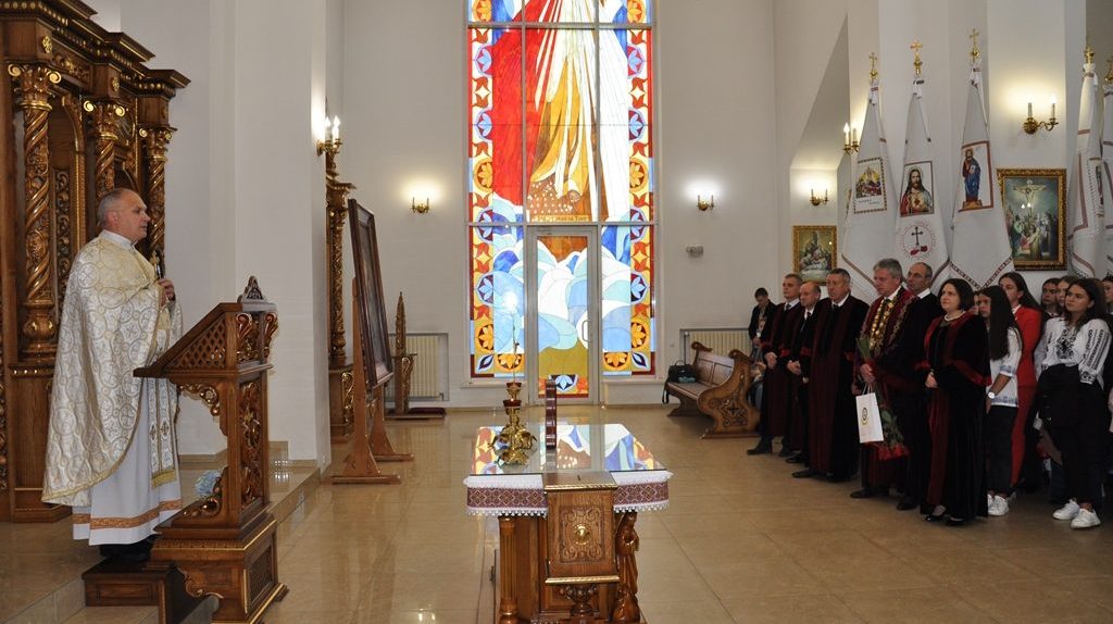 Традиційно святкова академія з нагоди посвяти першокурсників у студенти розпочалася з Божественної Літургії за благословення. На урочистому богослужінні, яке провів отець Микола Шиманський парафії Різдва Пресвятої Богородиці УГКЦ, були присутні ректор Університету Ігор Цепенда, представники ректорату, викладачі та працівники, першокурсники та їх батьки.