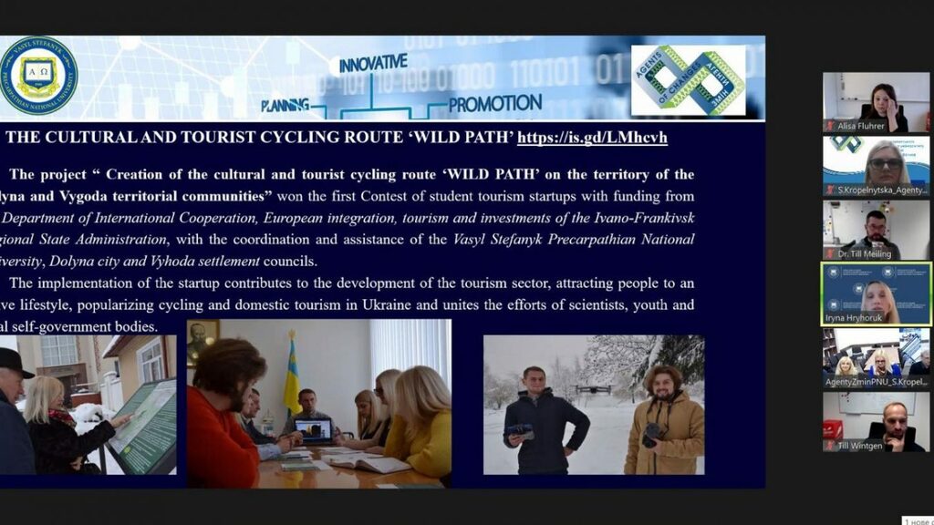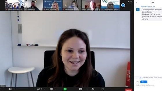 Європейські колеги презентували себе та розповіли про очікування від співпраці із ПНУ. Наукову, інноваційну діяльність Прикарпатського національного університету імені Василя Стефаника і роботу в напрямку підтримки студентських стартапів та підприємництва з презентувала онлайн начальниця науково-дослідної частини Університету, доцент кафедри управління та бізнес-адміністрування Ірина Григорук. Вона також розповіла учасникам зустрічі про успішно реалізовані Регіональний акселератор GCIP для інновацій, технологій та стартапів у Івано-Франківській області, відзначила і студентські проекти соціального підприємництва та туристичні стартапи, розроблені та реалізовані за участі та координації Проектно-освітнього центру «Агенти змін».