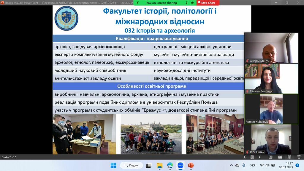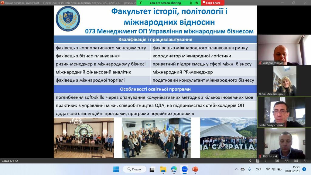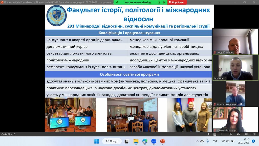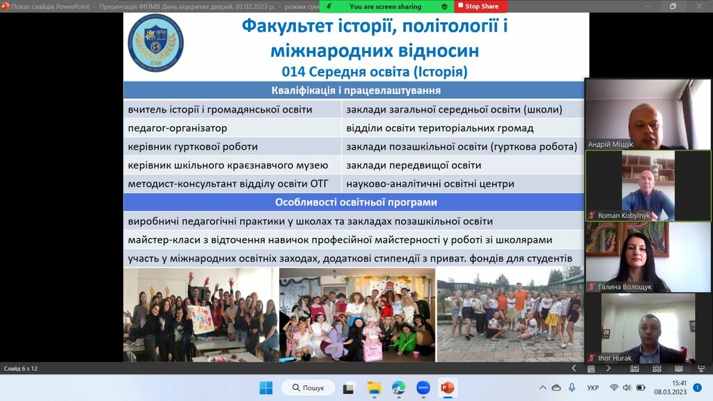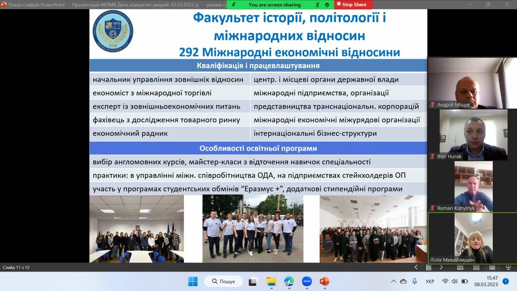 8 березня 2023 р. у рамках проєкту «Університет для учнів», який здійснює Прикарпатський національний університет імені Василя Стефаника, представники Факультету історії, політології і міжнародних відносин за допомогою відео конференції Zoom зустрілись з майбутніми абітурієнтами – школярами закладів загальної середньої освіти Єзупільської ТГ.