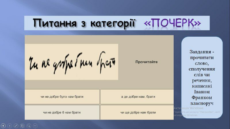 5) категорія «почерк»: завдання – прочитати слово, сполучення слів чи речення, написані Іваном Франком власноруч.