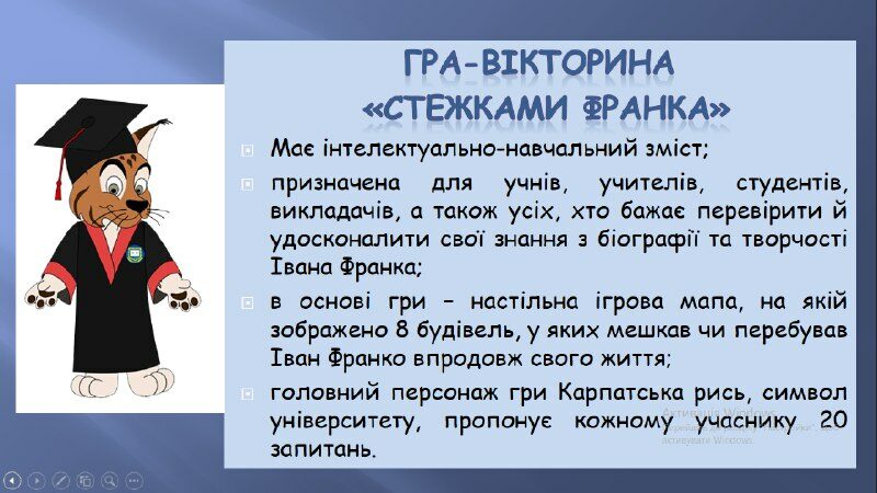 «Інтелектуально-навчальна «Гра «Стежками Франка» призначена для учнів, учителів, студентів, викладачів, а також усіх, хто бажає перевірити і удосконалити свої знання з біографії та творчості українського класика Івана Яковича Франка. Такі ігри допомагають оцінювати знання та доторкнутися до творчості наших видатних українців», – зауважила на початку презентації перша проректорка Прикарпатського національного університету імені Василя Стефаника Валентина Якубів.