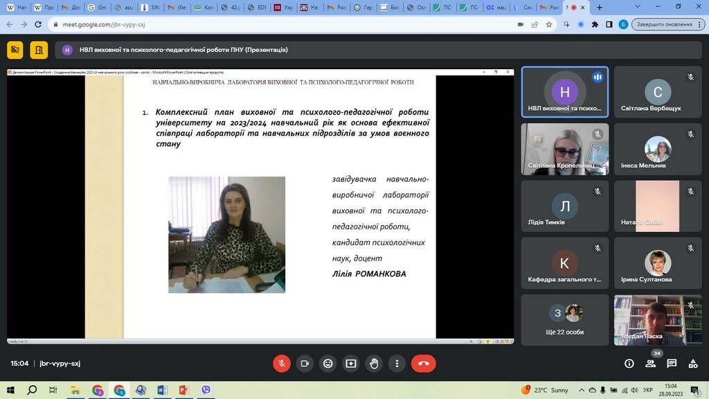 28 вересня 2023 р. відбулося розширене заняття навчально-методичного семінару з кураторами 1–3-х курсів, заступниками з виховної роботи усіх структурних підрозділів університету та аспірантами університету. Модераторами виступили завідуюча навчально-виробничої лабораторії виховної та психолого-педагогічної роботи, к. пс. наук, доц. Лілія Миколаївна Романкова та керівник семінару, методист вищої категорії, к. пс. наук, доц. Зоя Володимирівна Юрченко. Захід відбувся в онлайн-форматі на тему «Взаємодія лабораторії з навчальними підрозділами: стартові позиції 2023/2024 навчального року».